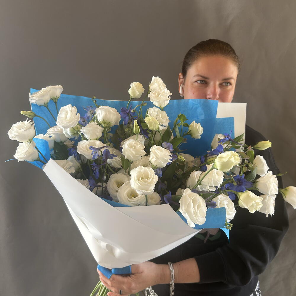 Lisianthus - 11 szt. delphinium - 7 szt. modern wrapping - 5 szt.