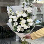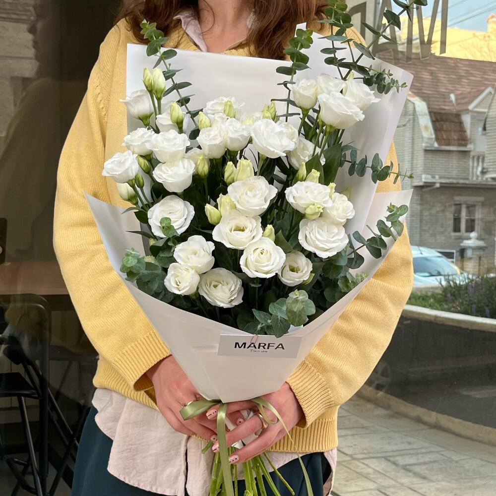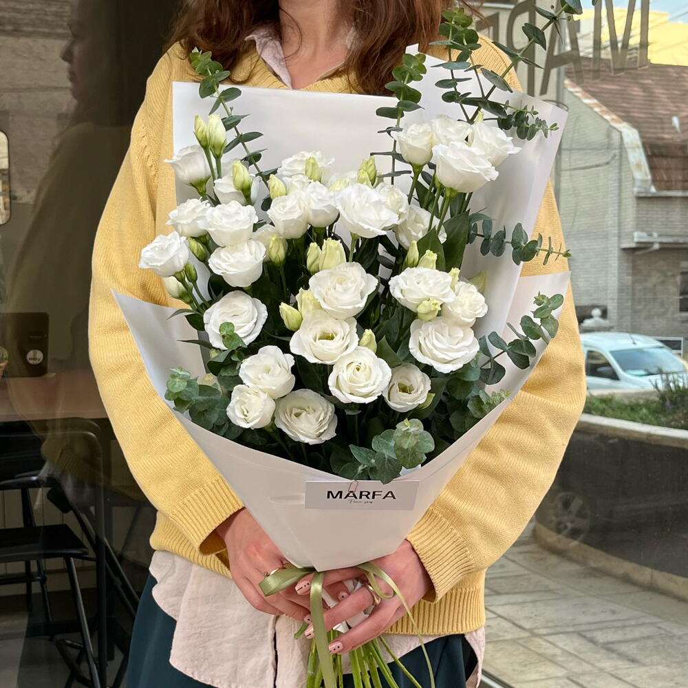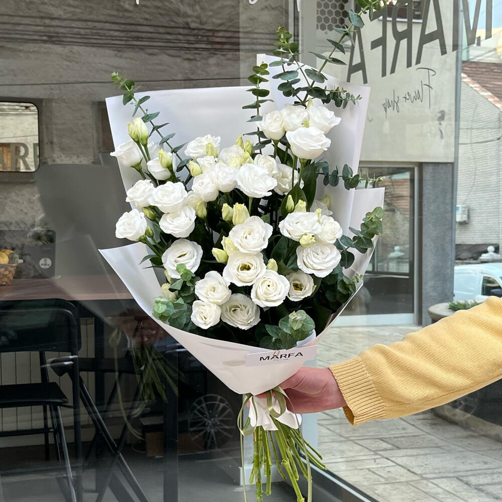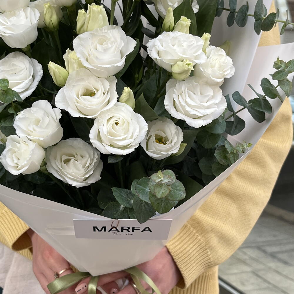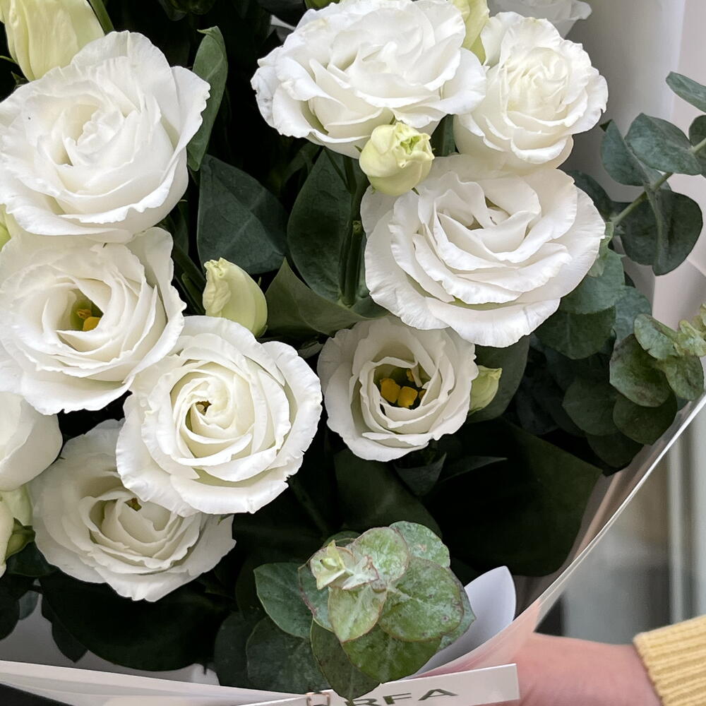 Elegant mono bouquet of white eustoma with eucalyptus.