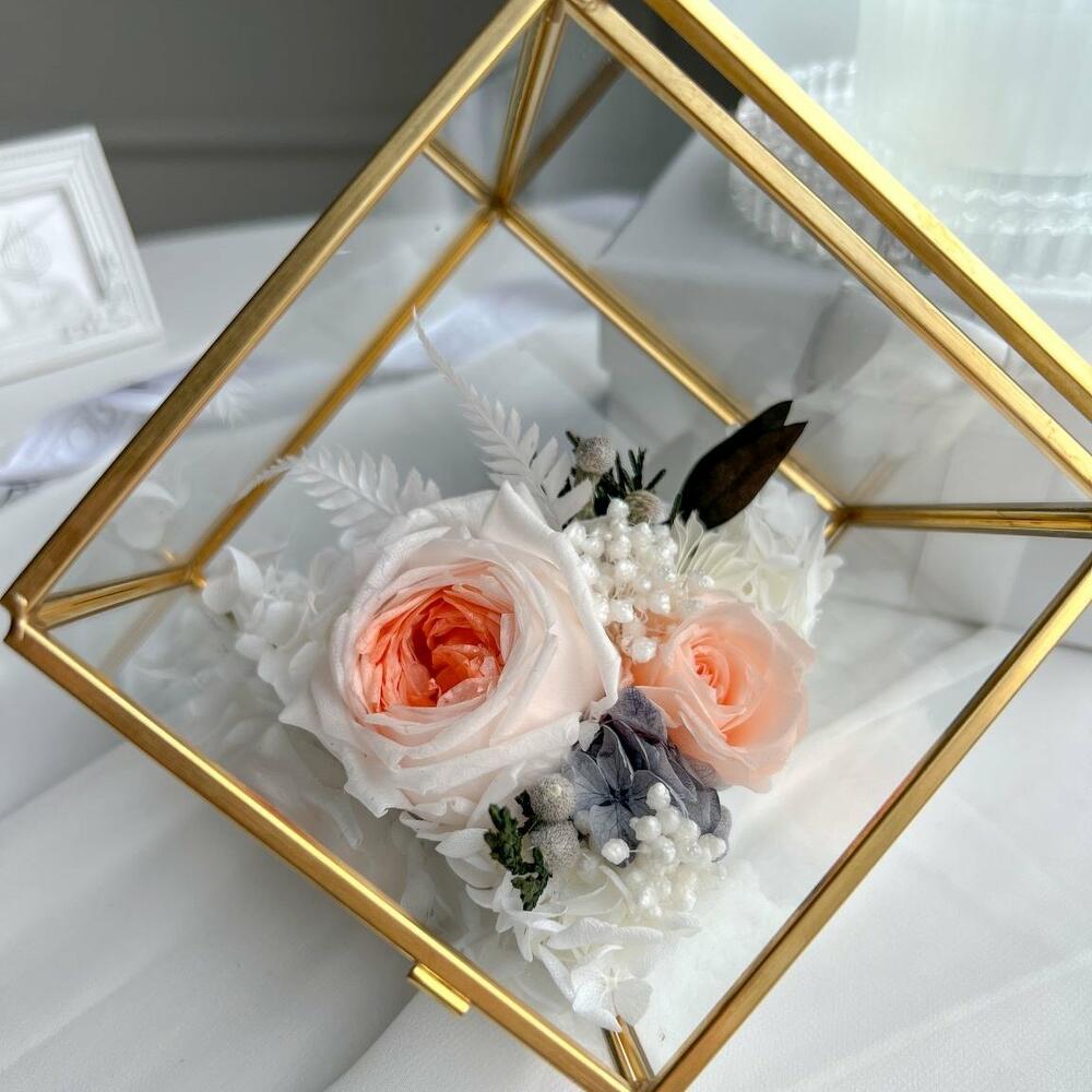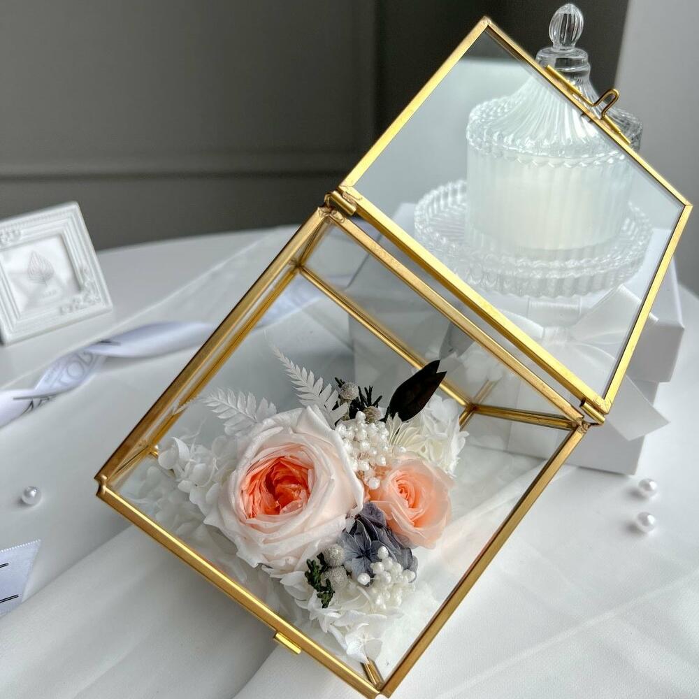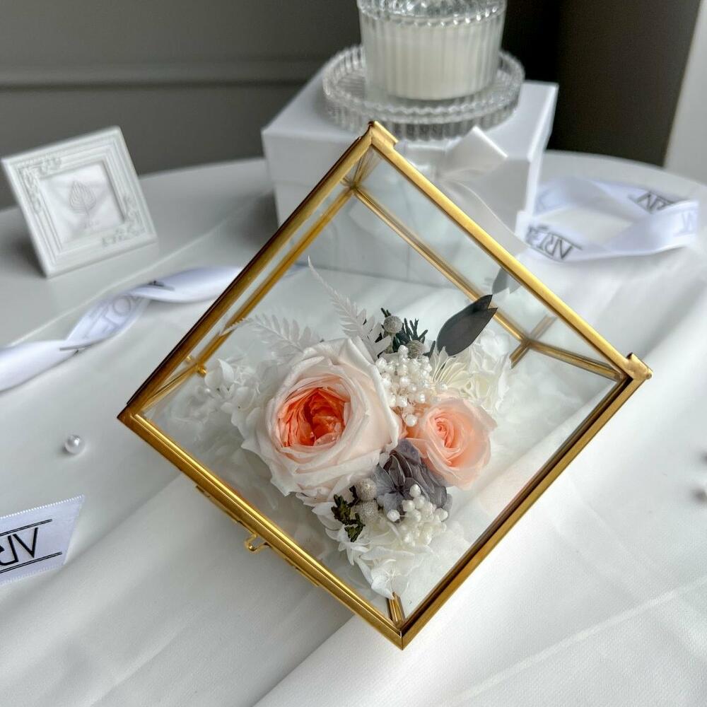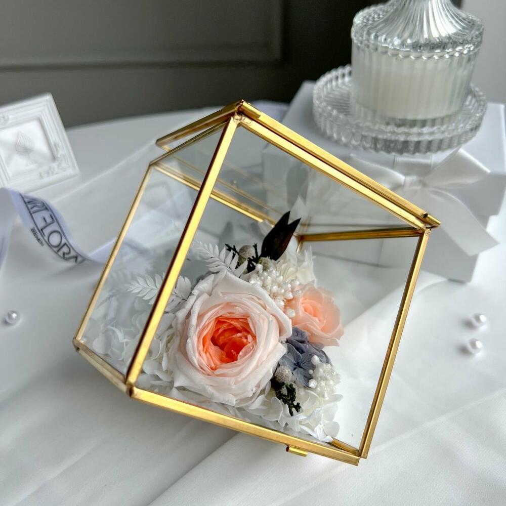 Würfel-Terrarium Champagner Blumen Ein Terrarium aus Glas und Metall gefüllt mit haltbaren Blumen wie Rosen, Hortensien, Chrysanthemen und anderen ist eine wunderschöne und langlebige Dekorationsidee für Ihr Zuhause oder Büro. Blumen-Terrarien von Art Floral sind geschlossene Glasbehälter, die Blummenarrangements aus konservierten Pflanzen sowie andere dekorative Elementen enthalten können. Haltbare Blumen sind echte Blumen, die durch einen speziellen Konservierungsprozess haltbar gemacht wurden. Sie behalten ihre Schönheit und Frische für lange Zeit und benötigen keine besondere Pflege. Eine Komposition aus Rosen, Hortensien und anderen haltbaren Blumen bietet eine schöne Kombination von Farben und Texturen. Hortensien sind für ihre üppigen Blütenstände und ihre Fähigkeit, Farbe zu halten, bekannt. Die Komposition bietet lange Haltbarkeit und eine große Auswahl an Farben und Texturen. Das Glas- und Metall-Terrarium bietet eine moderne und elegante Möglichkeit, Ihre haltbaren Blumen zu präsentieren. Die Metallrahmen sind in goldener Farbe gestaltet worden, um das design edel und elegant zu vollenden und den Einrichtungsstil Ihres Raumes zu ergänzen. Die Arrangements aus unserer Infinity Kollektion bestehen aus echten Blumen in höchster Qualität. Die Blumen wurden unter idealen Wetterbedingungen in der Äquatorregion gezüchtet. In der besten Blütezeit mühsam geschnitten, sortiert und einem komplizierten Konservierungsverfahren unterzogen, um Ihre ursprüngliche Schönheit über Jahre zu erhalten. Unsere Kompositionen aus haltbaren Blumen sind ein wertvolle Geschenke für den lieben Menschen und eine tolle Dekoration für jedes Interieur.