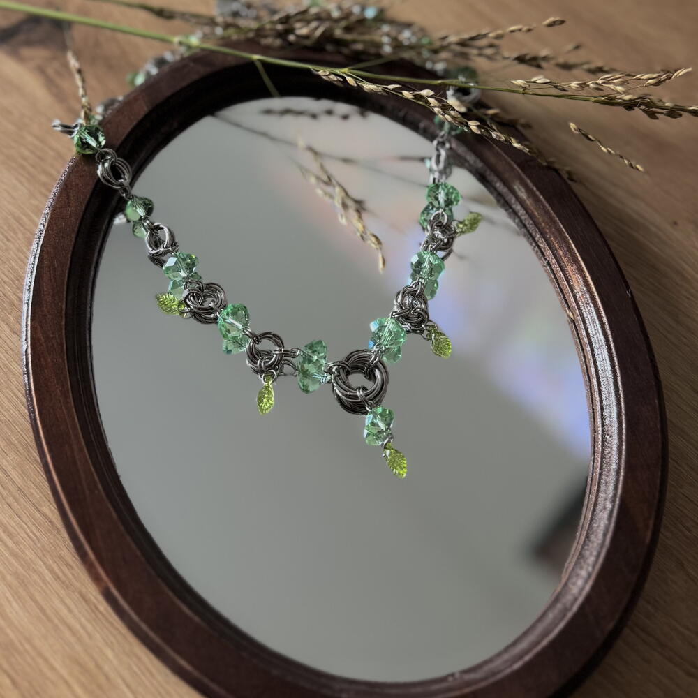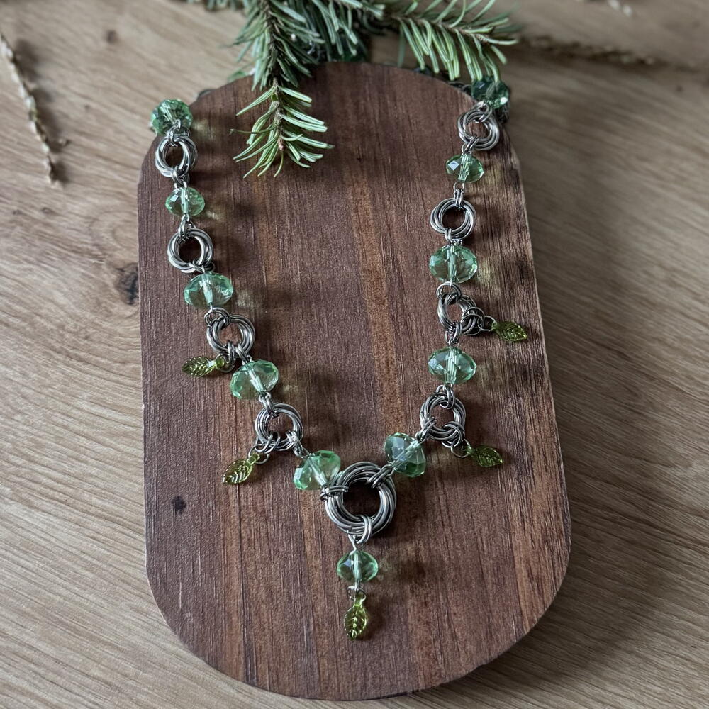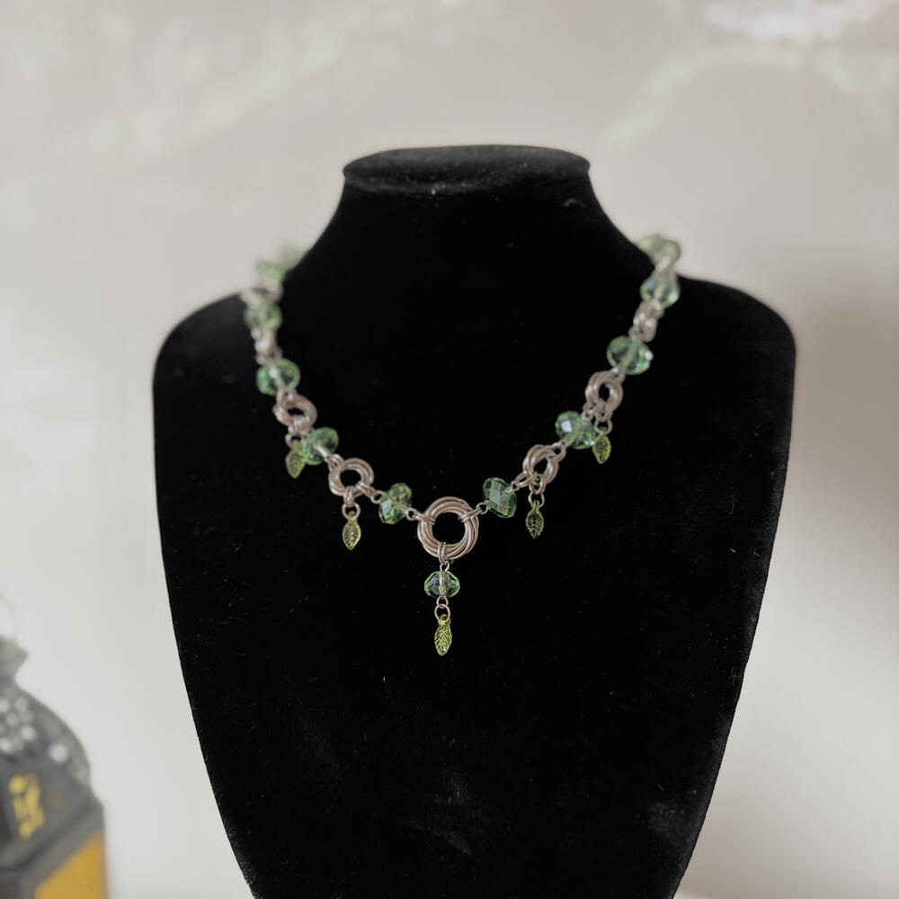 A spring fairy necklace with green faceted glass beads that sparkle with sunbeams. The clasp is a crab claw, the length is 46 cm.