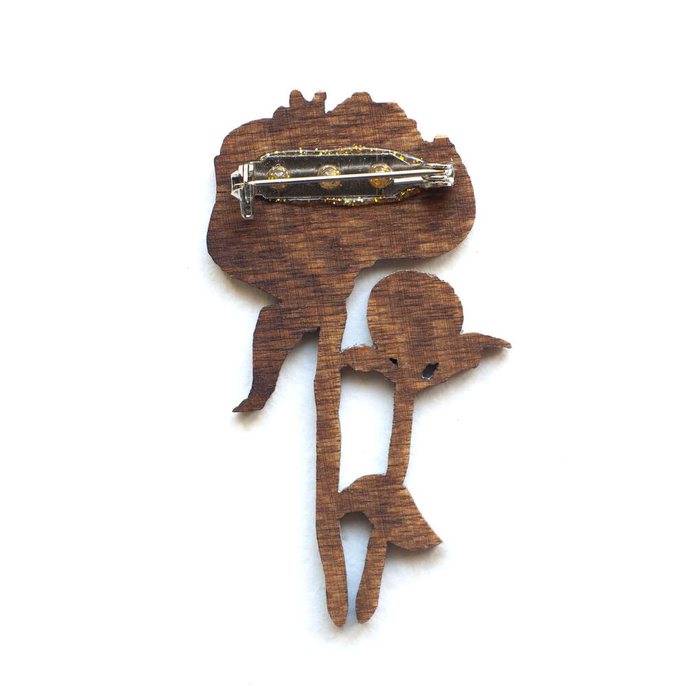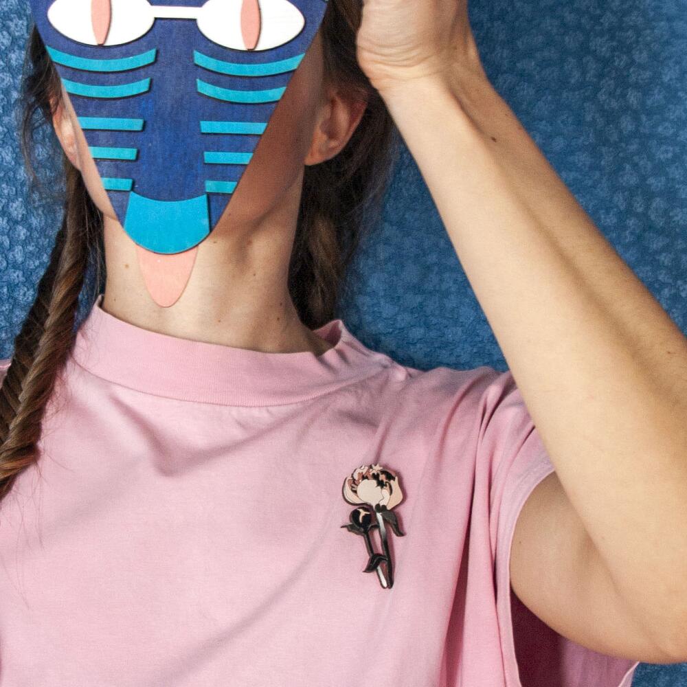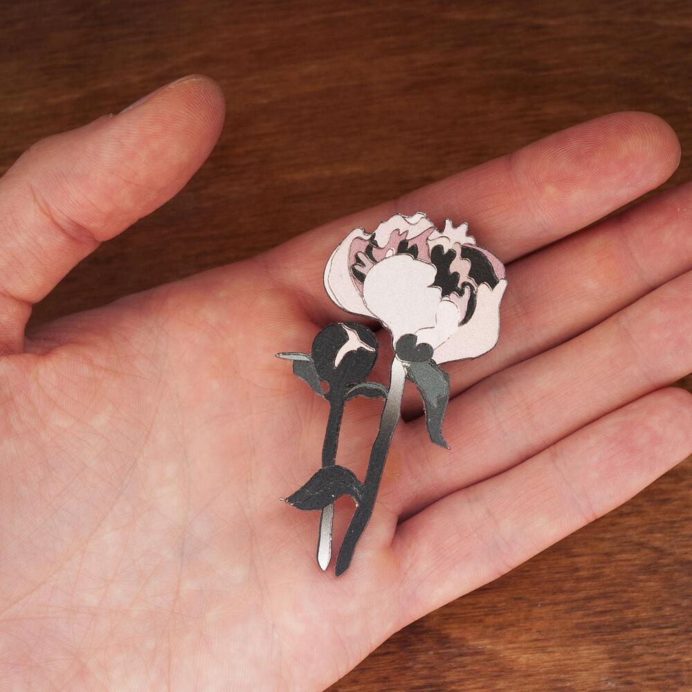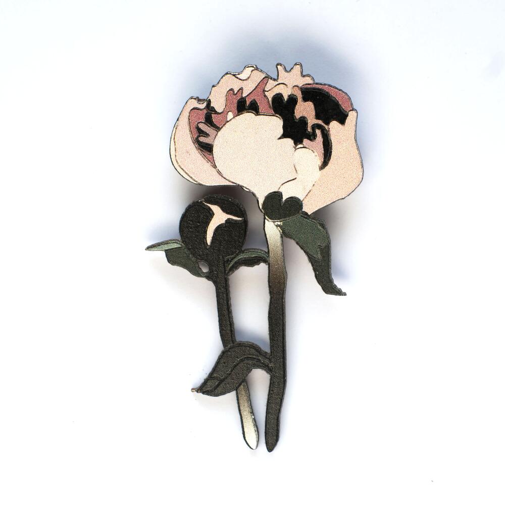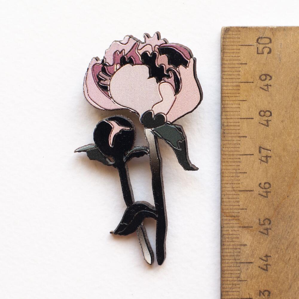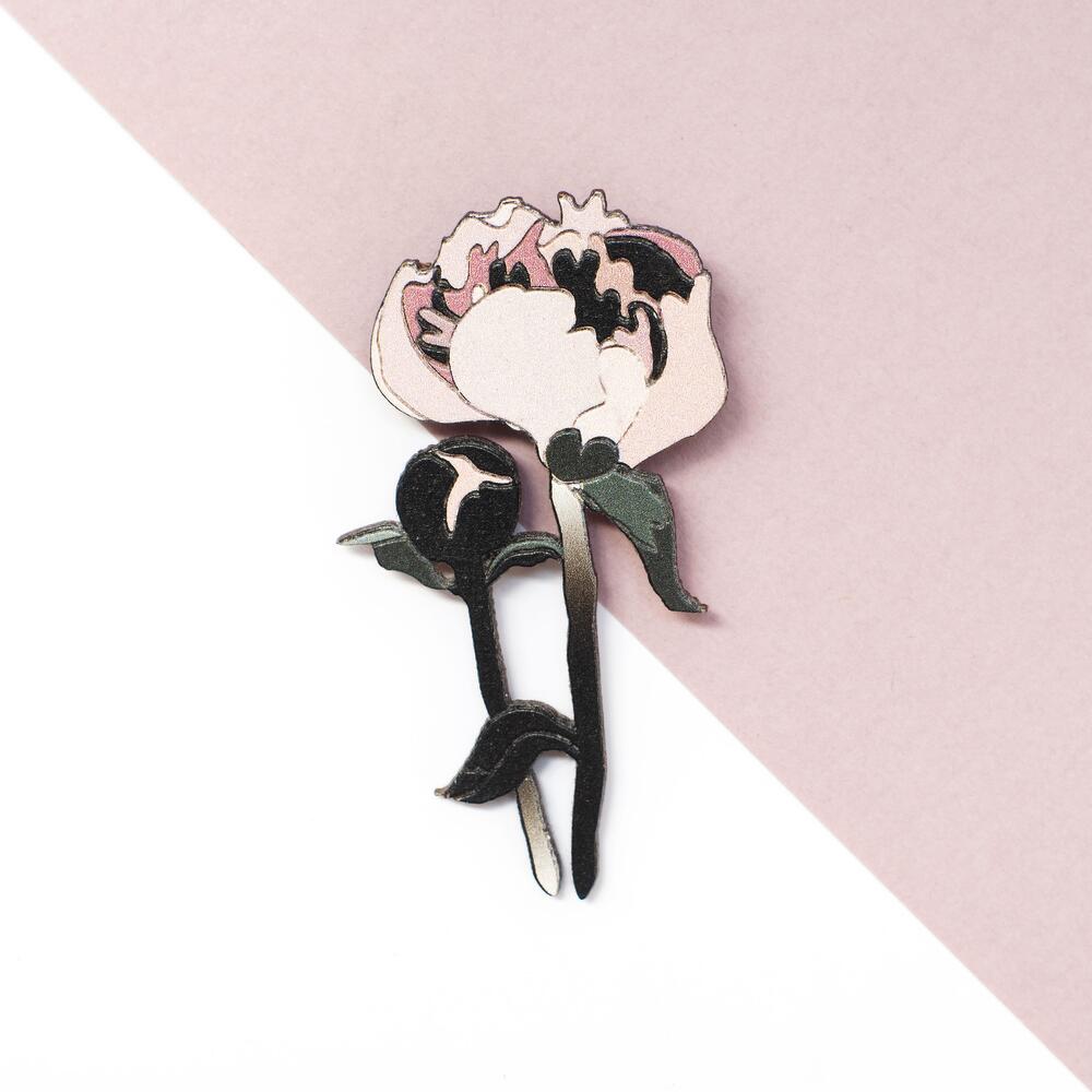 Wooden pin with engraving, sophisticated and gentle pink flower, size 35 x 65 mm