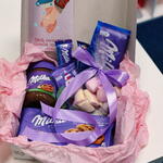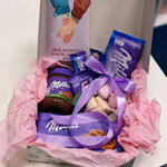 Perfect sweet Milka box for her mood in violet colors 💜 + Custom postcard as a gift. Perfect gift from NOMAD Flowers.