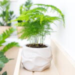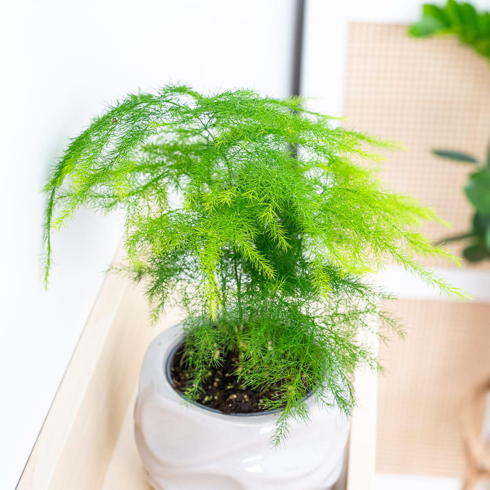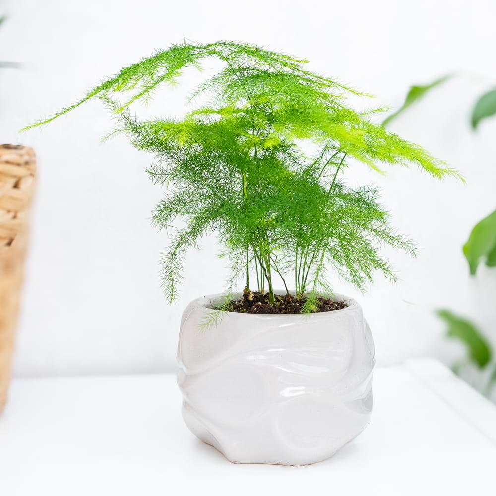 Asparagus Plumosus is an exceptionally delicate potted plant with feathery, soft, and light shoots resembling a fern. It forms dense, spreading clumps with a lacy appearance that bring lightness and freshness to interiors. Although it looks ethereal, it is a surprisingly hardy plant. Sometimes it produces thin, twining shoots that can be trained on supports. It grows relatively quickly and tolerates pruning well. In favorable conditions it can bloom with small, white flowers. Thanks to its elegance, it pairs beautifully with modern and classic decor.