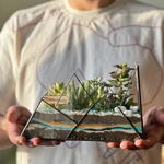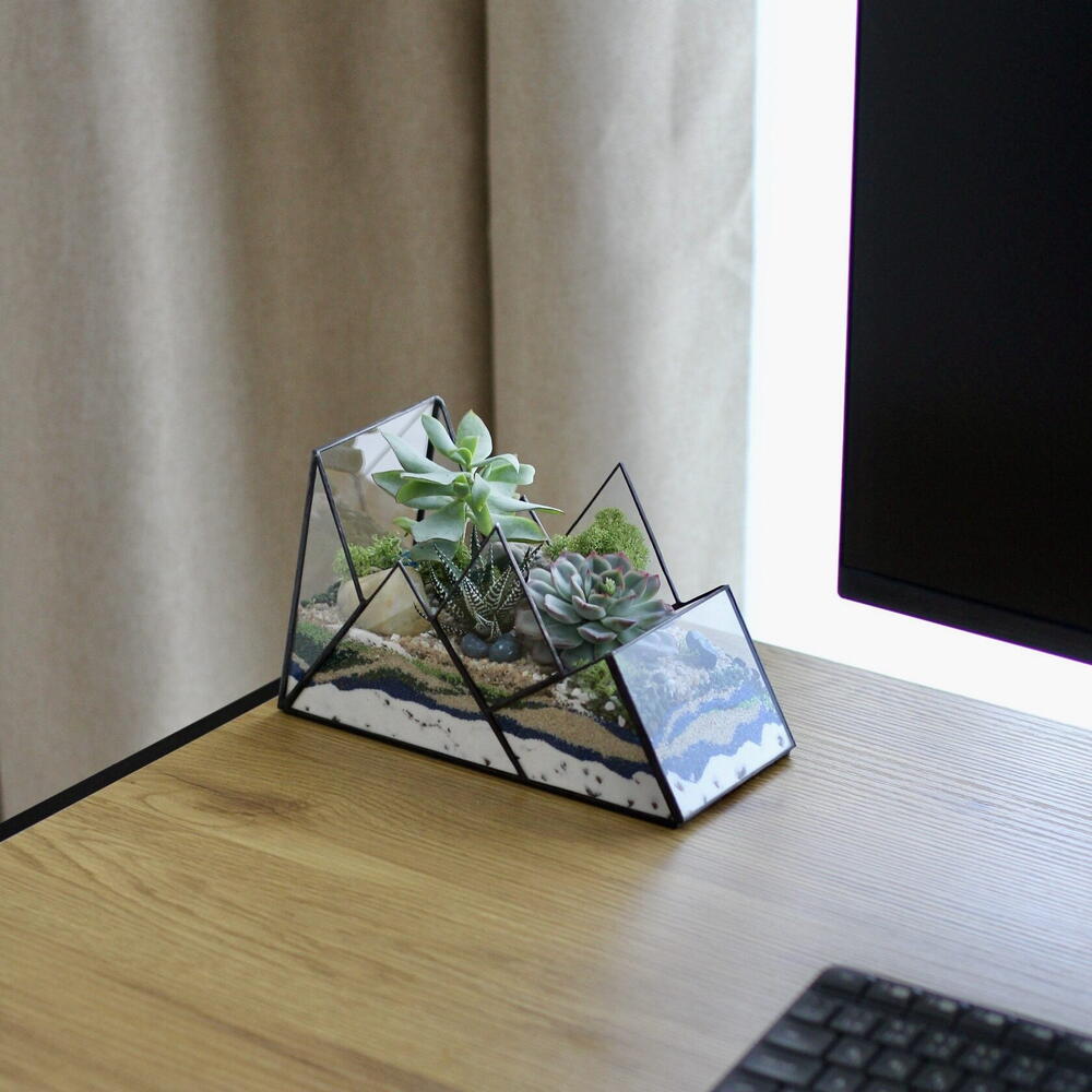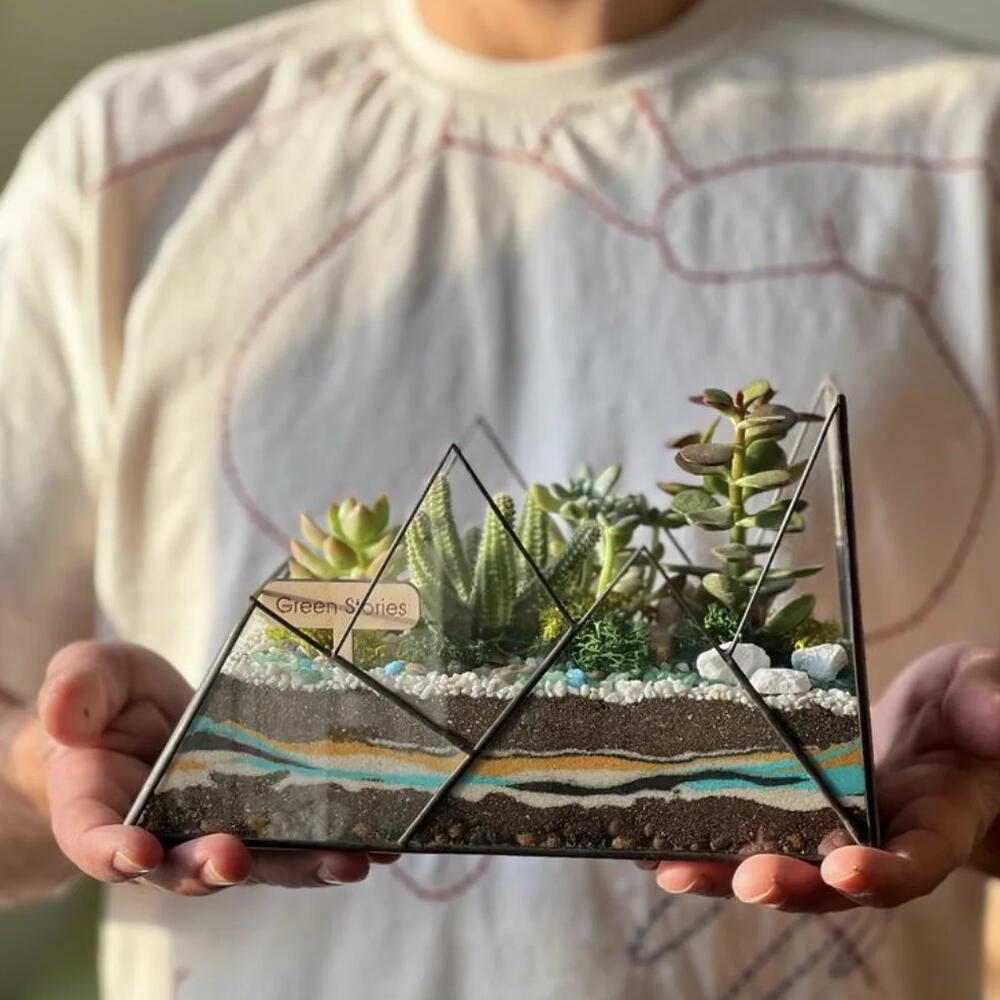 This geometric glass terrarium “Mountain” is a handmade piece of living art inspired by nature and modern design. Created in our Prague studio, each terrarium is individually soldered and filled with live succulents, natural stones, and layered sand in earthy and turquoise tones that resemble mountain peaks. It’s an eye-catching accent for any home or office and a meaningful gift for nature lovers. Every terrarium is made to order, and you can request custom details — such as plant types, sand colors, or decorative stones — when placing your order.