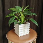 Philodendron Birkin is a striking indoor plant known for its deep green leaves decorated with elegant creamy-white pinstripes. Each leaf has a unique pattern, making every plant one of a kind. Planted in a modern square striped pot, this piece brings a clean, contemporary look to any interior. It’s a perfect choice for home décor, office spaces, or as a stylish and long-lasting gift. Perfect for: — modern home interiors — office desks and shelves — housewarming gifts — plant lovers of all levels What you’ll receive: ✔ Live Philodendron Birkin ✔ Decorative square striped pot ✔ Healthy, well-rooted plant ✔ Ready to display