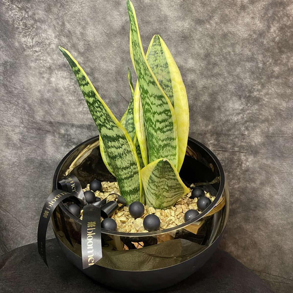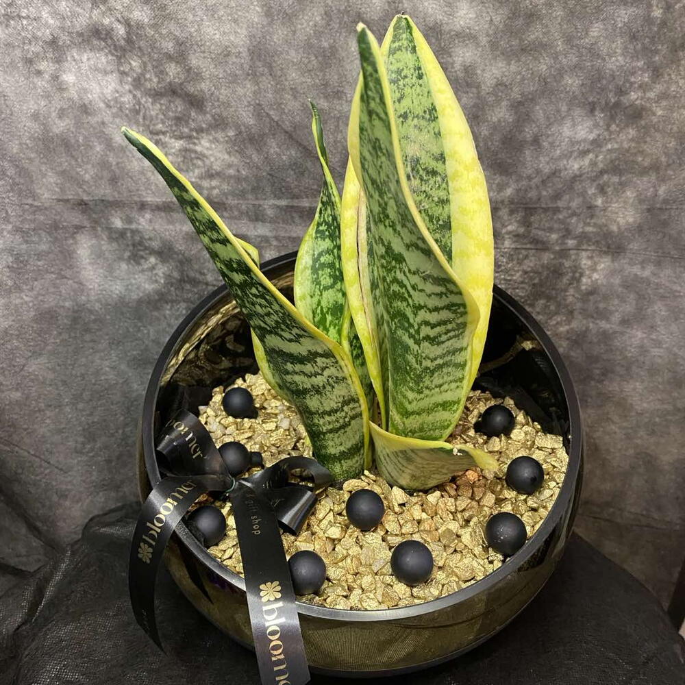 sanseveria is planted in a glass black and gold zinnia, decorated with gold pebbles and black balls