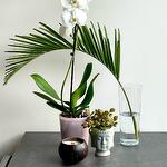 Orchid Phalaenopsis with one shoot in a glass Dutch Design with coconut candle hand made and phytonia