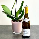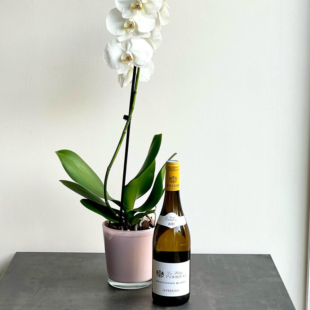 Orchid phalaenopsis with one shoot in a glass pot Dutch Design with French white wine