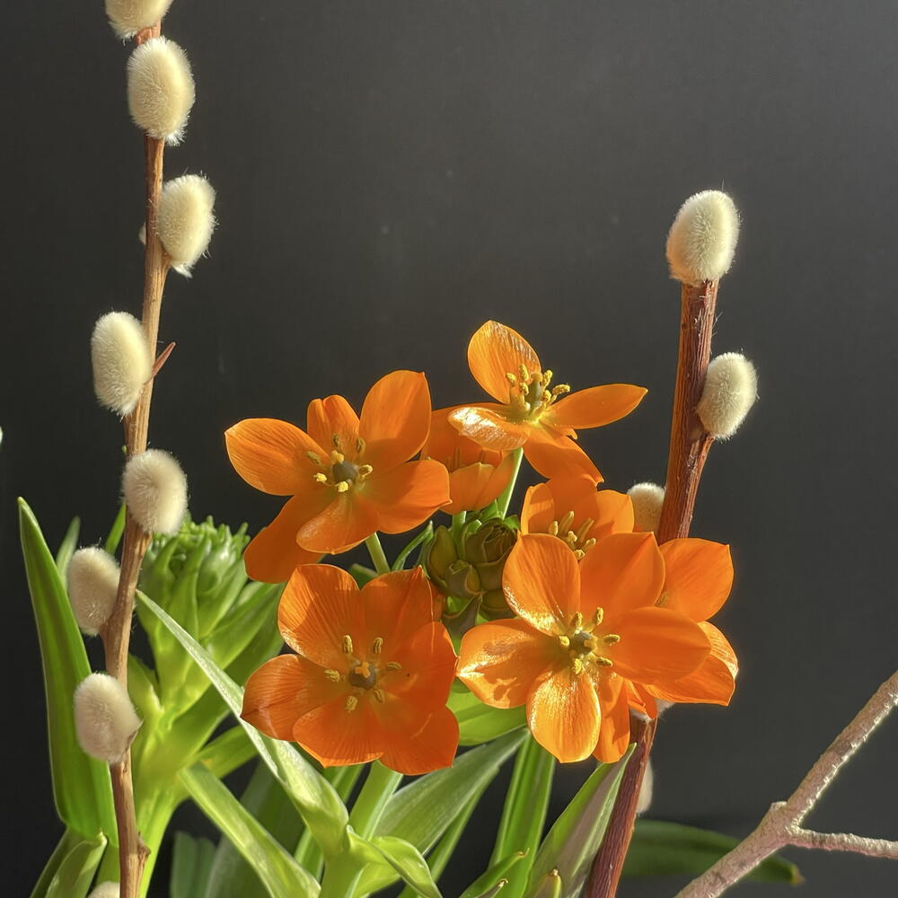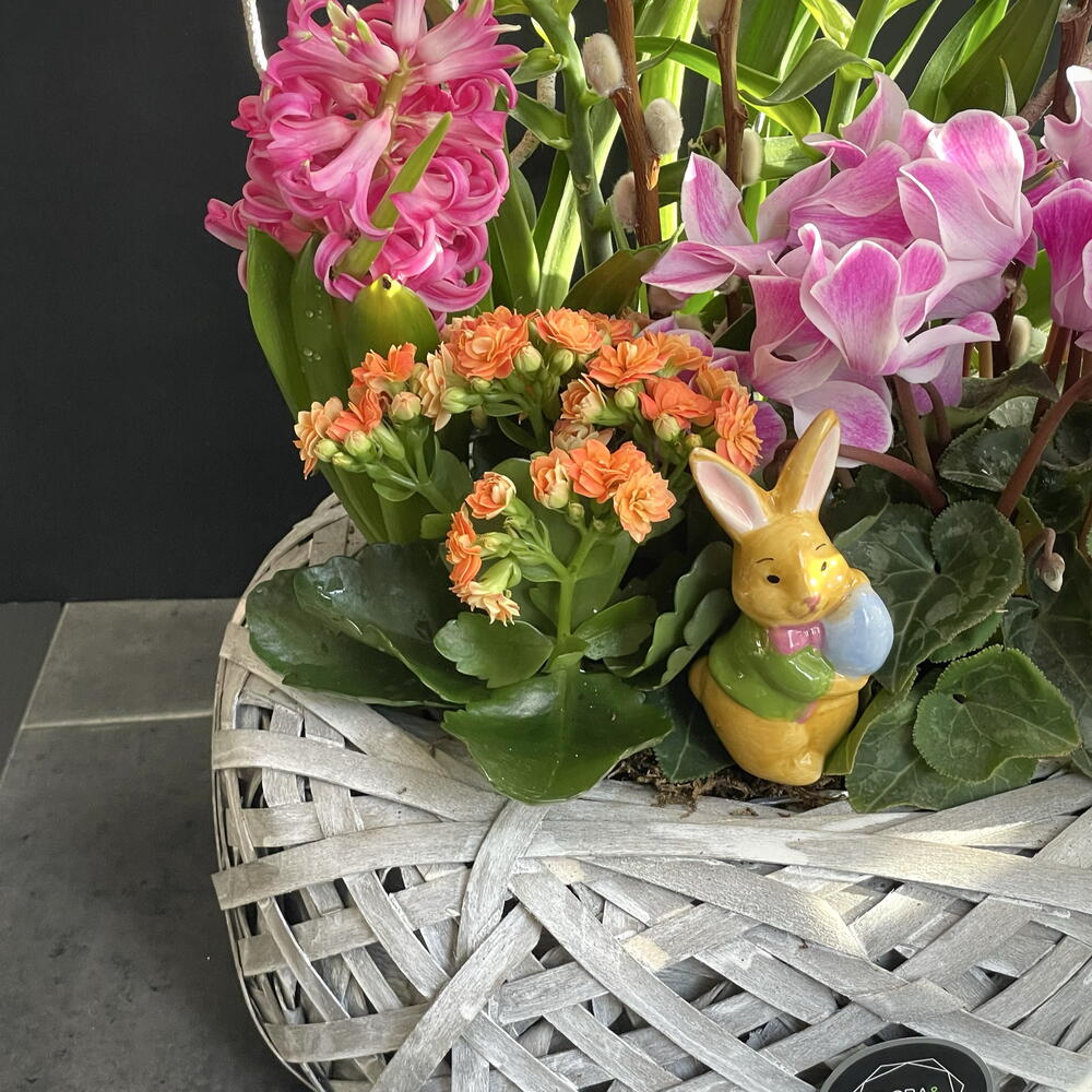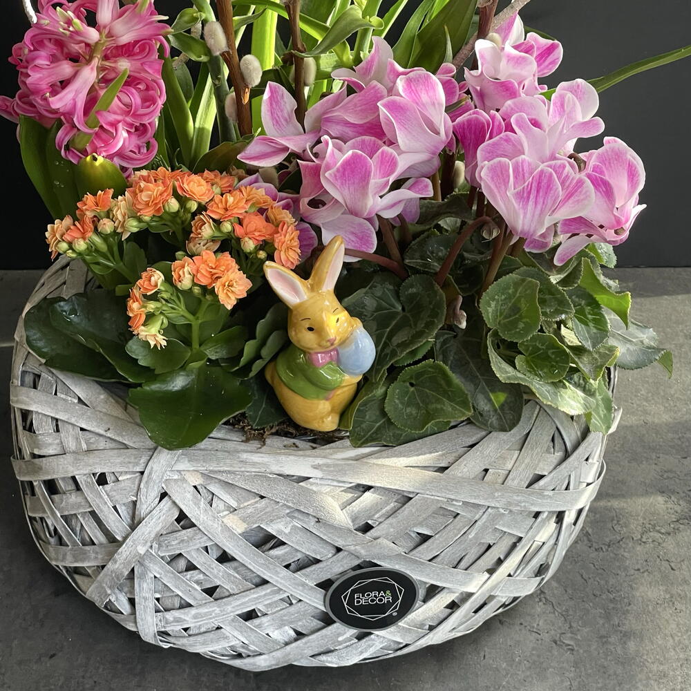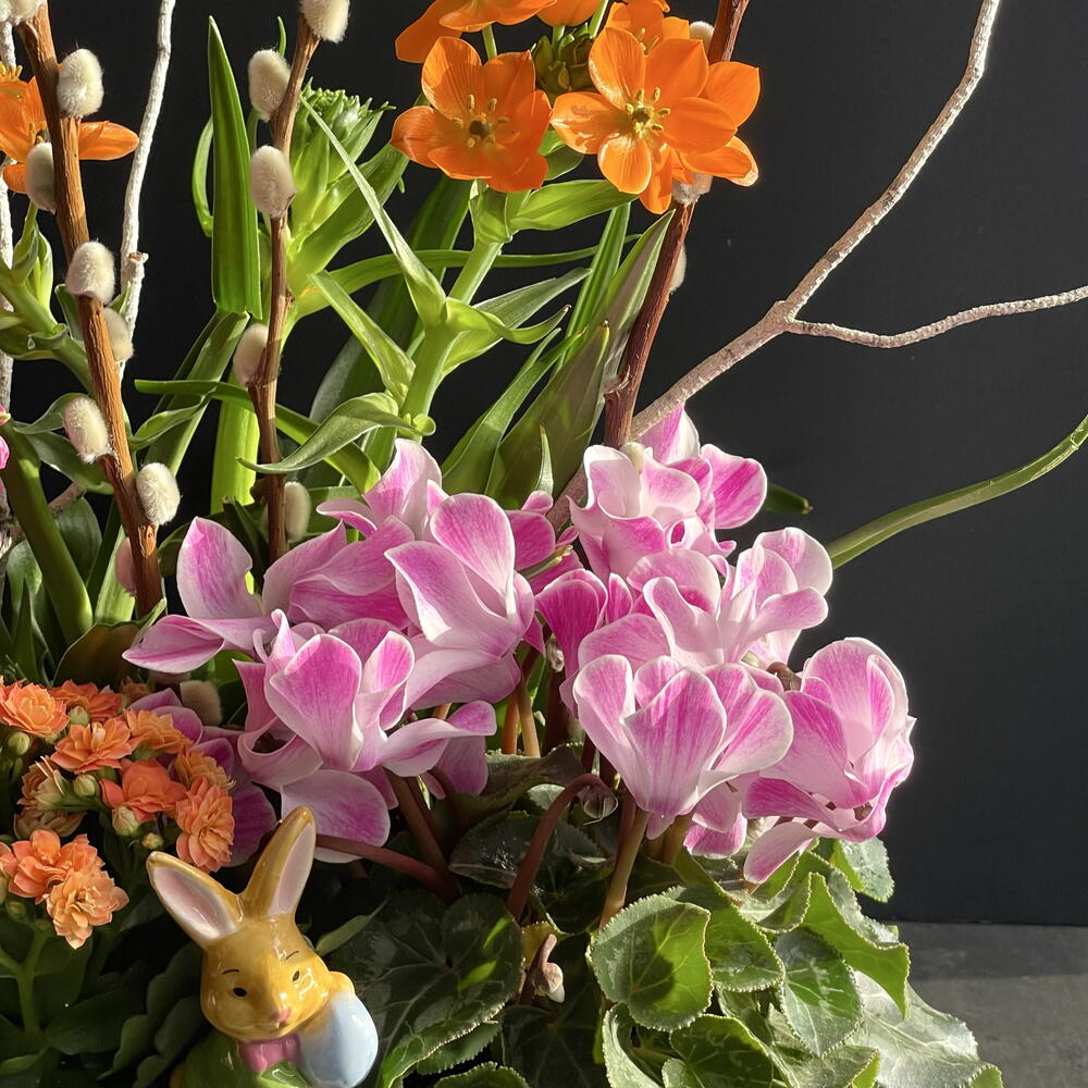 Spring composition in a flowerpot made of ornithogalum, cyclamen, hyacinth, Kalanchoe, willow branches and moss.