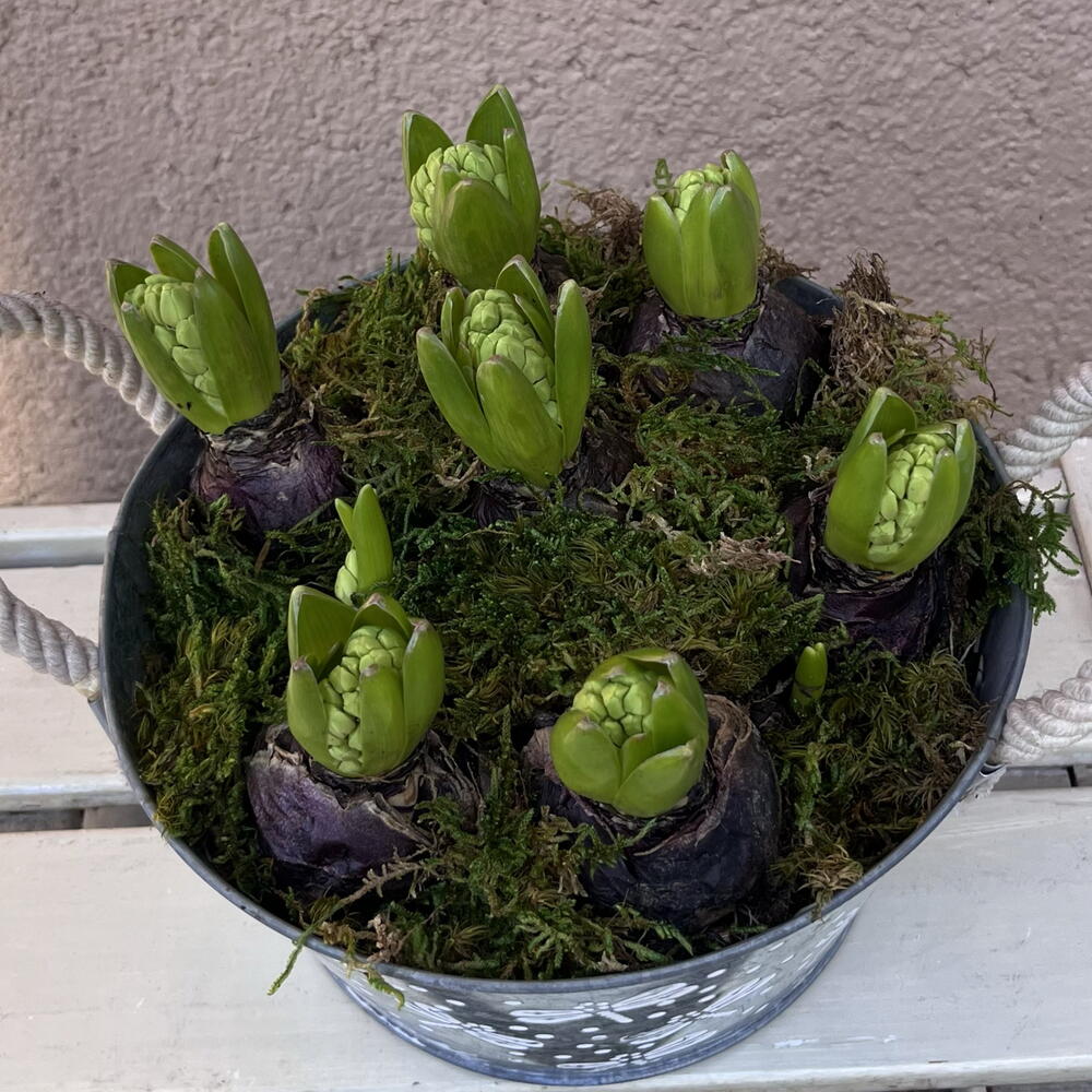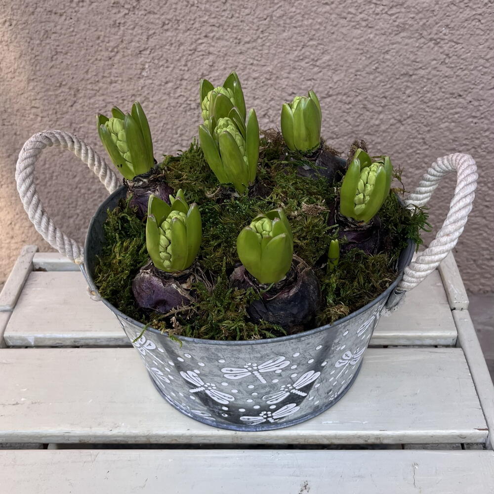 7 Fresh hyacinths in metal bucket that will delight you with their blooms for a long time to come