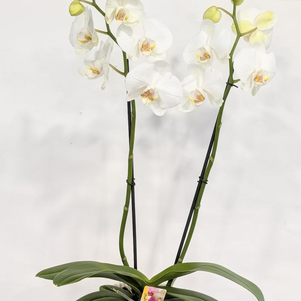 White Double Stem Phalaenopsis in a ceramic, pot.