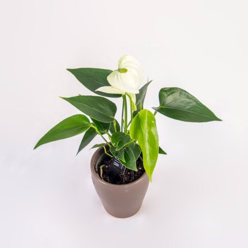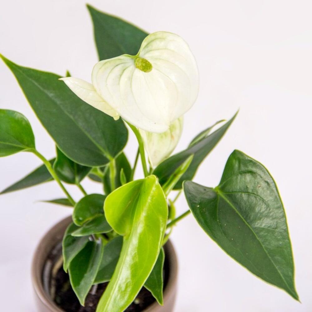 Elevate your home or office with the clean, elegant simplicity of this white anthurium, also known as the flamingo flower. This sophisticated plant features pristine white, heart-shaped spathes that emerge gracefully from deep green, glossy foliage.