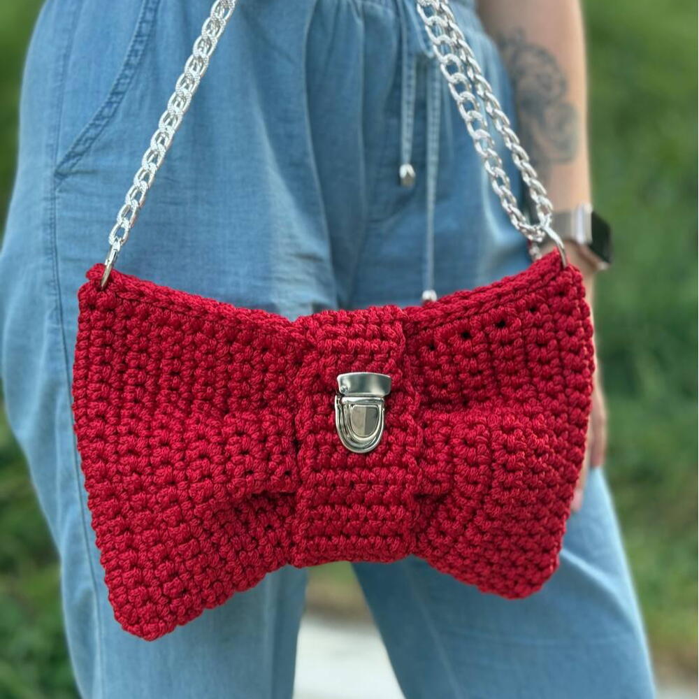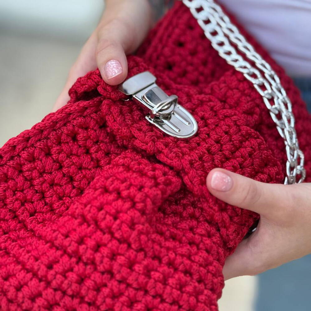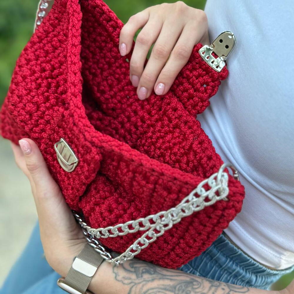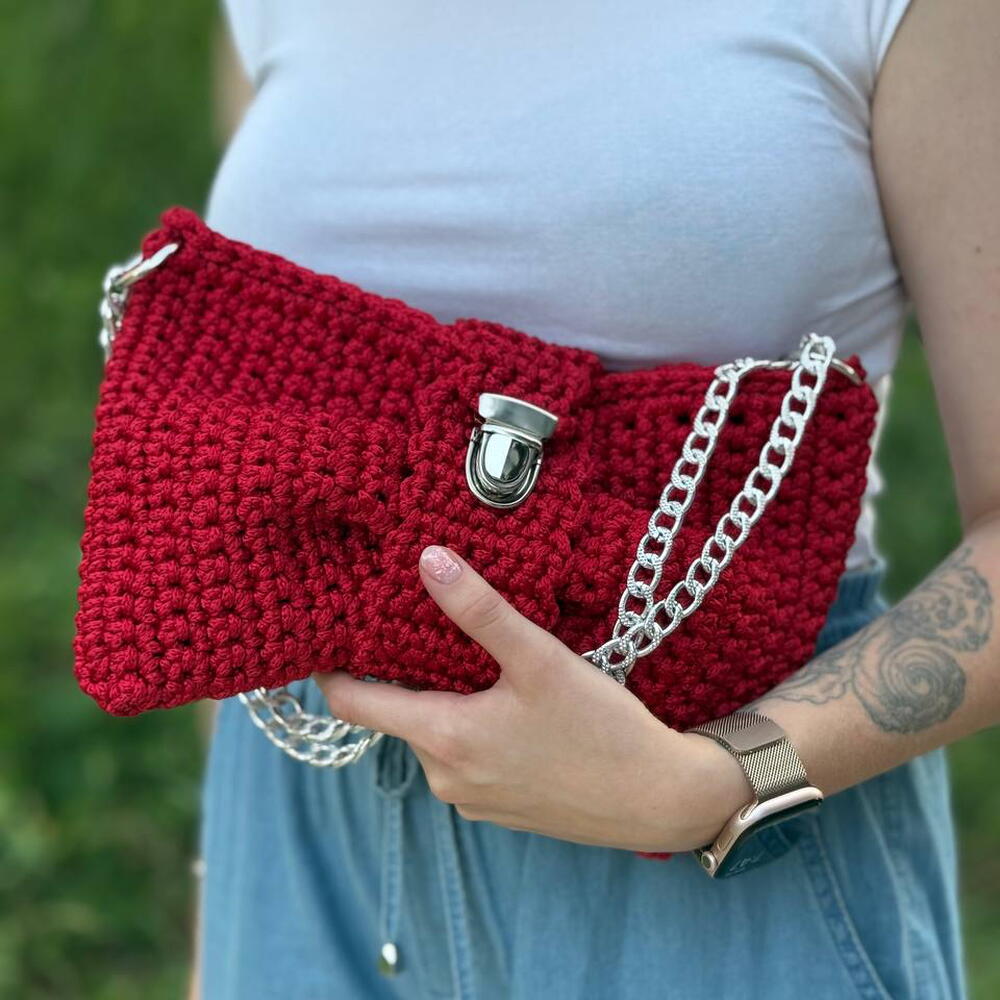 Стильный вязаный клатч насыщенного красного цвета — идеальный аксессуар для вечернего образа или повседневного стиля с акцентом. Сумка выполнена вручную из плотной пряжи, хорошо держит форму и выглядит дорого и фактурно. Металлическая цепочка и замок добавляют элегантности и делают модель универсальной — можно носить как в руке, так и на плече. Отличный вариант для подарка или для себя Stylish handmade crochet clutch in a rich red color — a perfect accessory for both evening outfits and everyday looks with a bold accent. Made from thick yarn, it keeps its shape beautifully and has a premium textured feel. The metal chain strap and clasp add elegance and versatility — wear it as a clutch or a shoulder bag. A great gift idea or a special treat for yourself