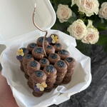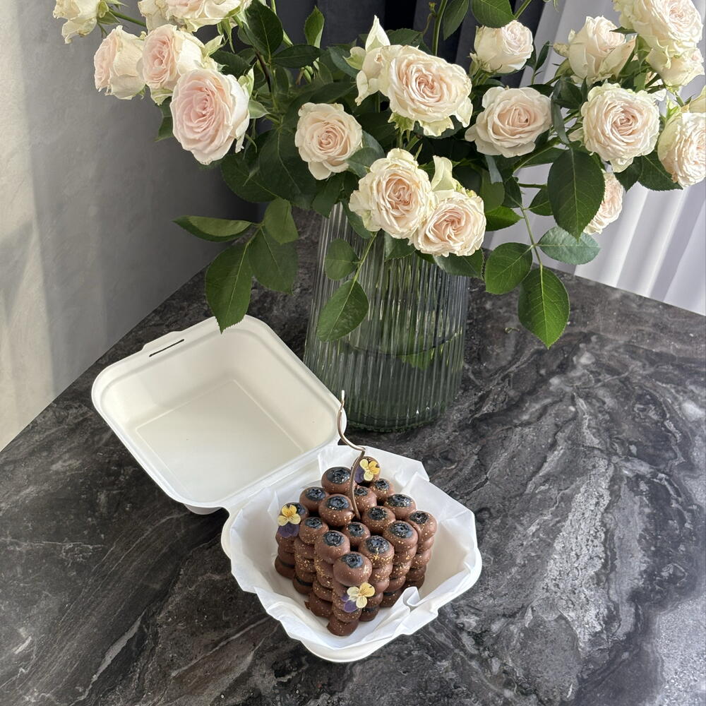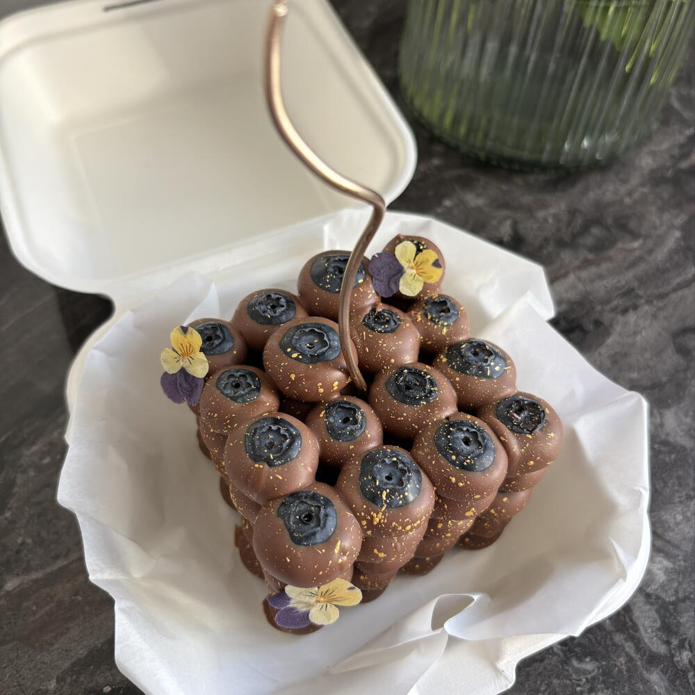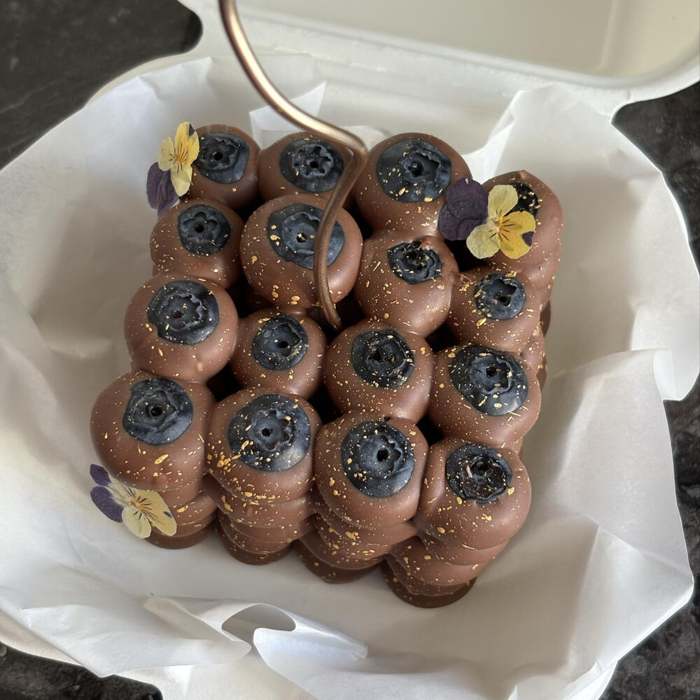 Голубика свежая Шоколад бельгийский (сахар, какао-масло, сухое цельное молоко, соевый лецитин и натуральный ароматизатор ванили) Кандурин (пищевое золото) Сублимированные цветы (декор)