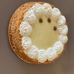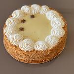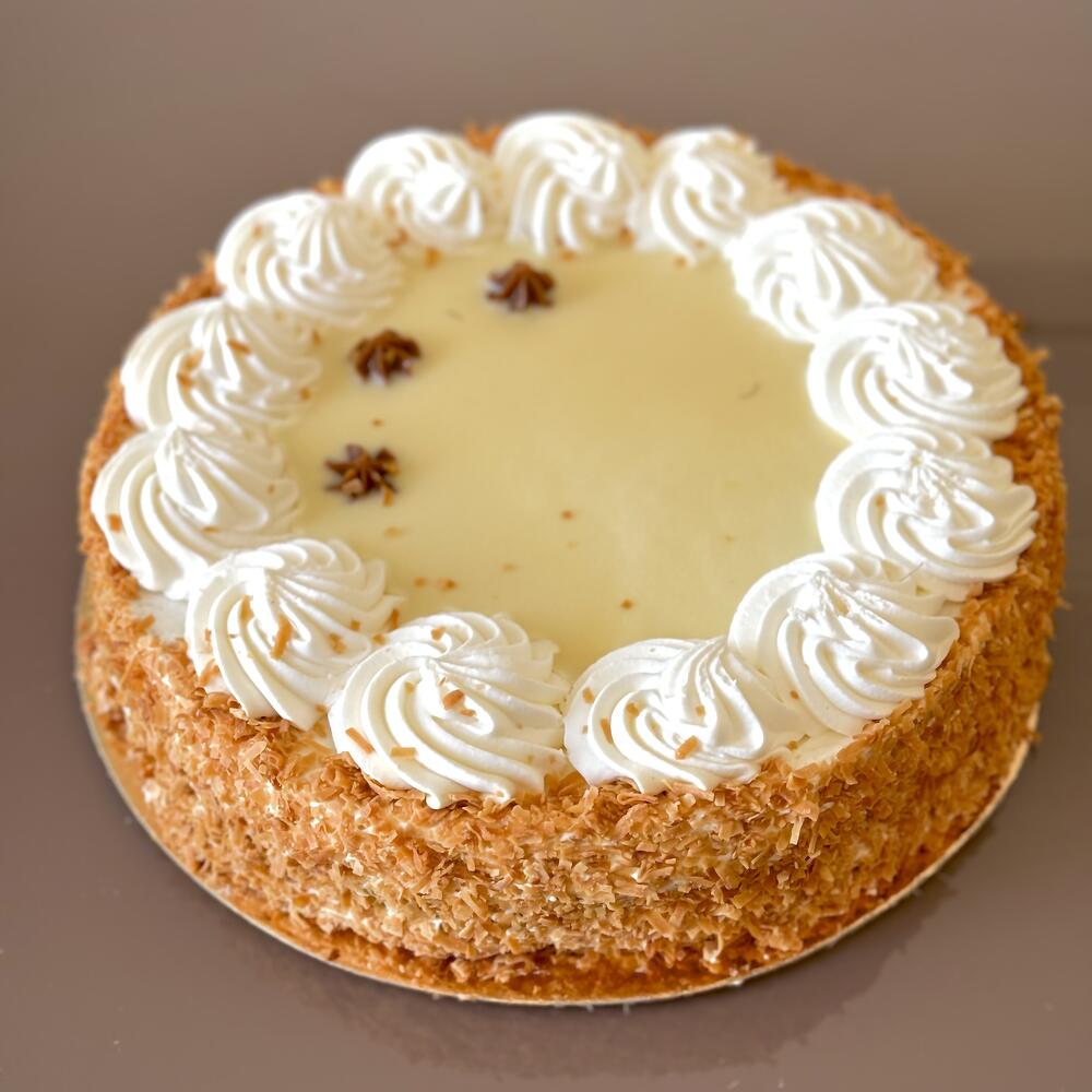This elegant birthday cake features a traditional design with a perfect balance of textures and flavors. The cake includes: • Light sponge cake layers - Soft and airy cake base • Smooth custard filling - Creamy vanilla custard center with a silky texture • Meringue rosettes - Beautifully piped white meringue swirls arranged in a decorative circle around the top edge • Toasted crumb coating - Golden, crunchy cake crumbs adorning the sides for added texture and visual appeal • Star anise garnish - Delicate whole star anise pieces placed in the center for an elegant finishing touch The cake sits on a gold cake board and showcases a classic, timeless design. The contrast between the smooth pale yellow custard top and the textured golden sides creates an appealing visual presentation. This cake is perfect for celebrations and serves as a sophisticated yet approachable dessert option suitable for birthdays and special occasions.