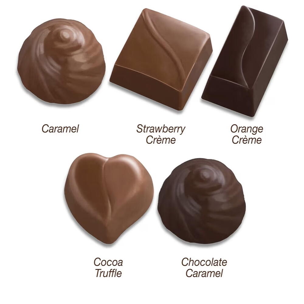 Молочный шоколад, темный шоколад, сахар, какао-масло, какао-масса, сухое молоко, сухое обезжиренное молоко, растительные жиры (пальмовое), сливки, клубничный ароматизатор, апельсиновый ароматизатор, карамель, какао-порошок, эмульгатор (соевый лецитин), натуральные и искусственные ароматизаторы, ваниль. ⸻ ⚠️ Информация об аллергенах Содержит молоко и сою. Может содержать следы орехов и пшеницы. ⸻ ? (Необязательно) Примечание к продукту: Ассортимент вкусов может незначительно отличаться в зависимости от коробки.