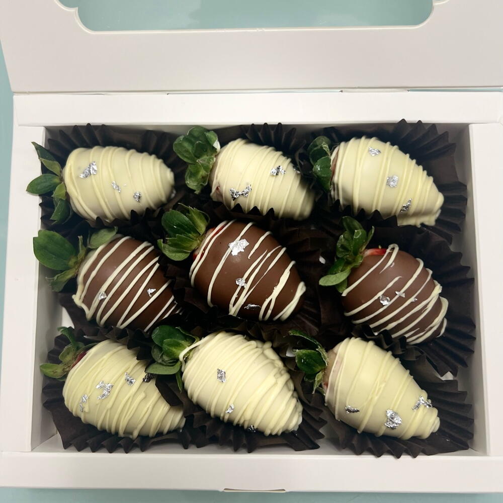 Fresh strawberries, white, black, milk chocolate.