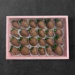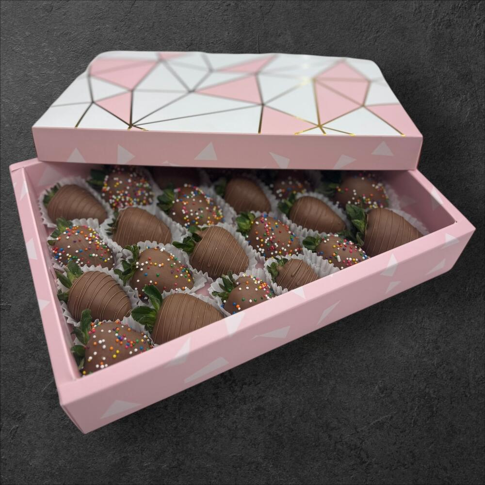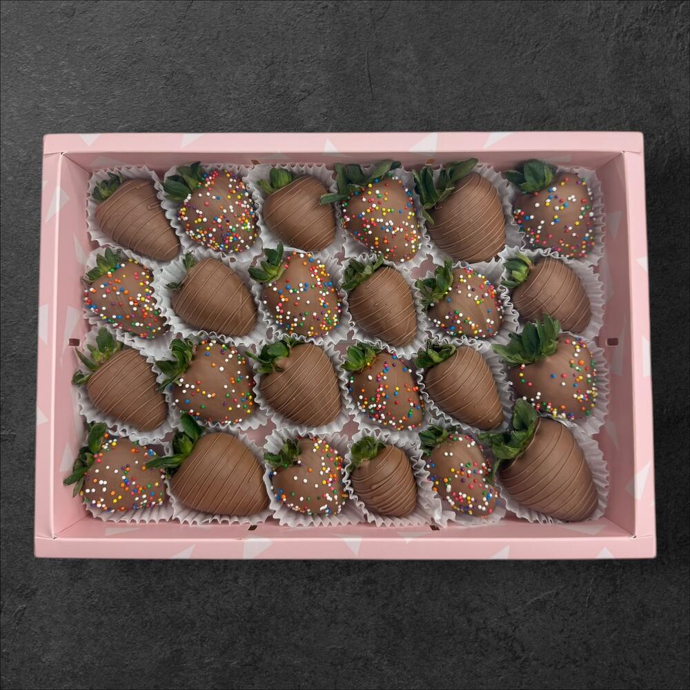 A delightful assortment of 24 hand-dipped milk chocolate-covered strawberries, crafted with rich chocolate and decorated beautifully for any occasion.