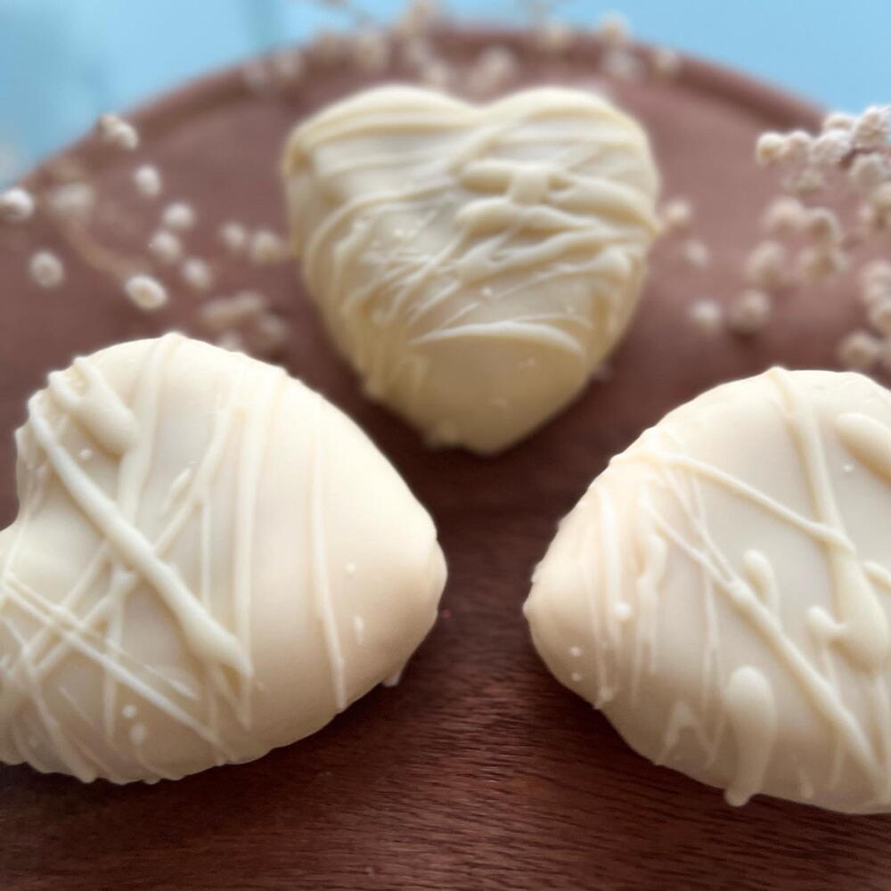 Sweet hearts in white chocolate are a tasty and healthy treat. It contains only natural ingredients. Chocolate can be coloured with strawberry powder to create a red colour. Order from 4 pieces. The top of the hearts will be decorated thematically, for the holiday.