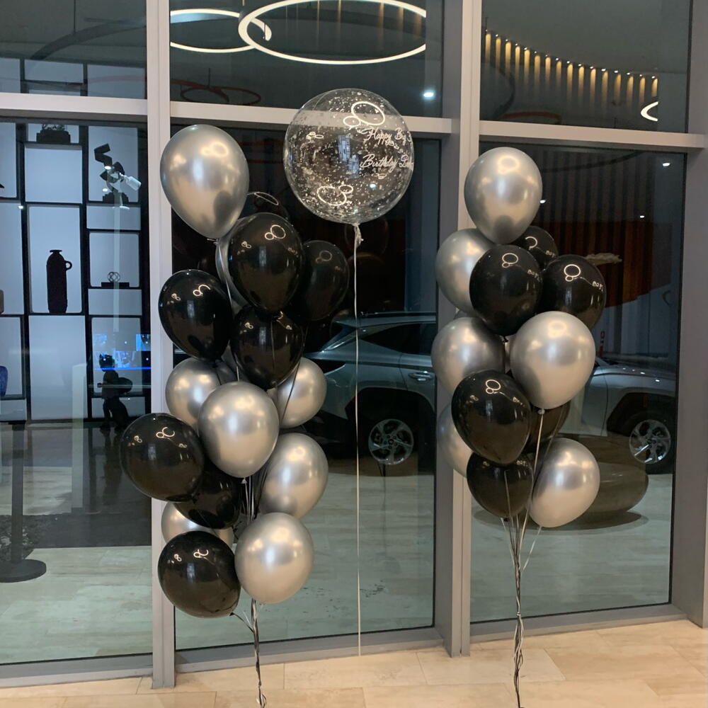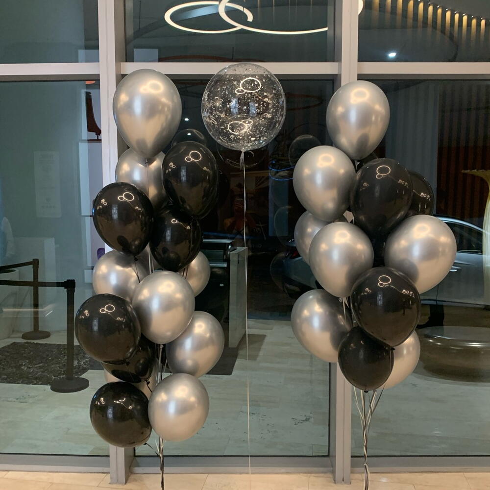 2 набора: 15 хромированных серебристых и 15 латексных черных шаров + 1 шар-болтун с принтом и конфетти.