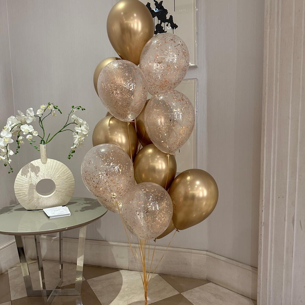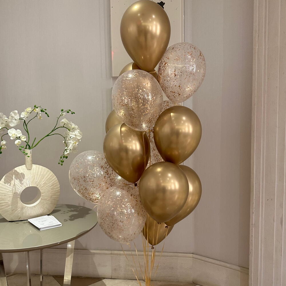 10 прозрачных шаров с золотым конфетти 10 золотистых хромированных шаров