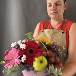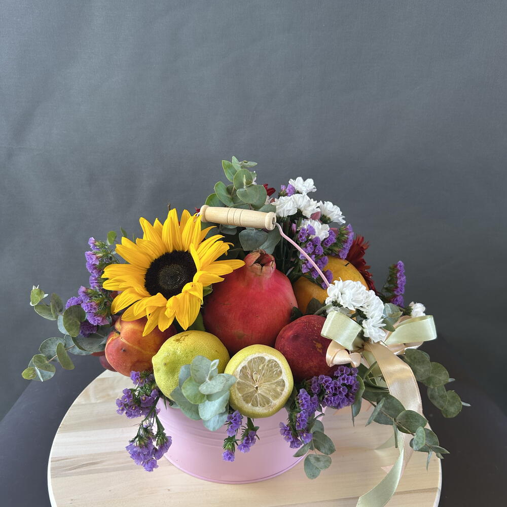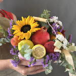 Хризантема - 2 шт. Box - 1 шт. Gerbera - 3 шт. statica - 3 шт. apple - 2 шт. lemon - 2 шт. grapes - 1 шт. mango - 2 шт. peach - 2 шт. green - 5 шт. pomegranate - 1 шт.
