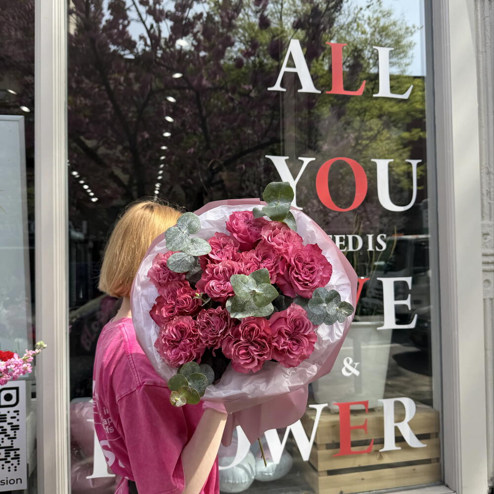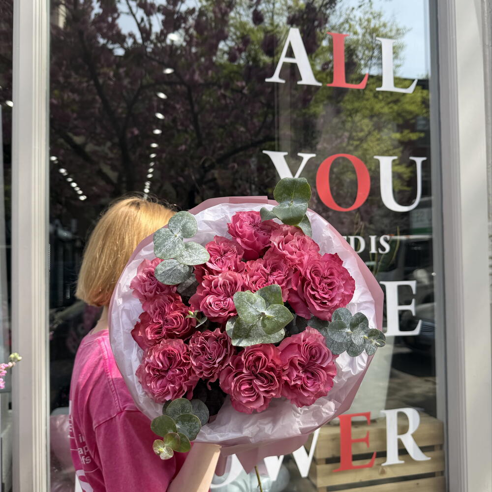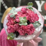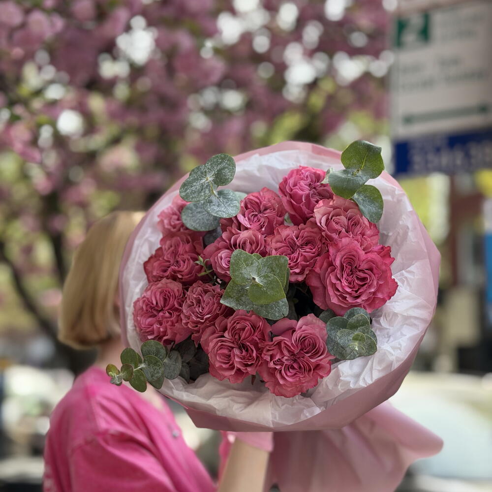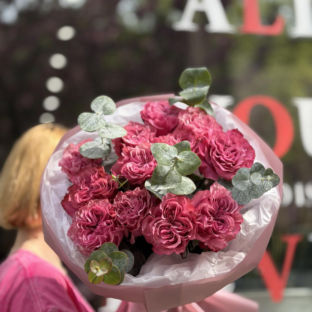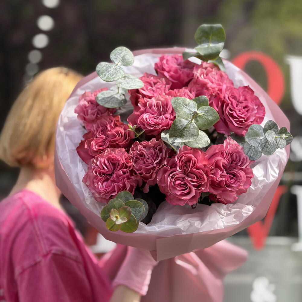 Нежный и романтичный букет из изящных розовых роз в сочетании со свежим эвкалиптом. Нежные оттенки румянца и тонкий аромат эвкалипта создают элегантную, воздушную композицию, идеально подходящую для искренних подарков и особых моментов.
