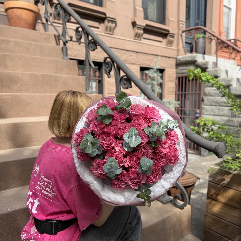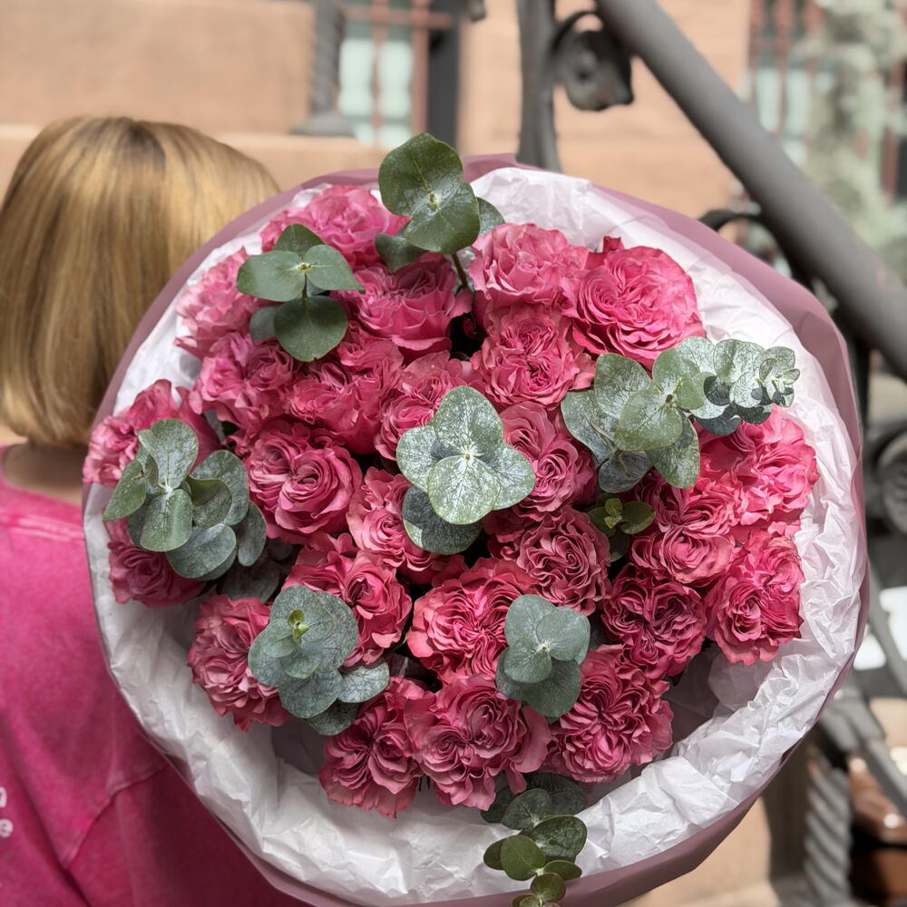 Нежный и романтичный букет из тончайших розовых роз в сочетании со свежим эвкалиптом. Нежные розовые тона и тонкий аромат эвкалипта создают элегантную, воздушную композицию — идеально подходящую для трогательных подарков и особых моментов.