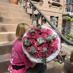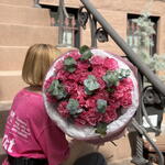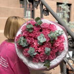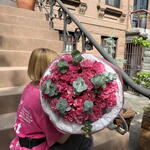 Букет красивый получился. Доставили немного позже назначенного времени, не критично для нас это было. Фото отчет сделали быстро. Доставка считаю дорогая, плюс большие розы не первой свежести были.