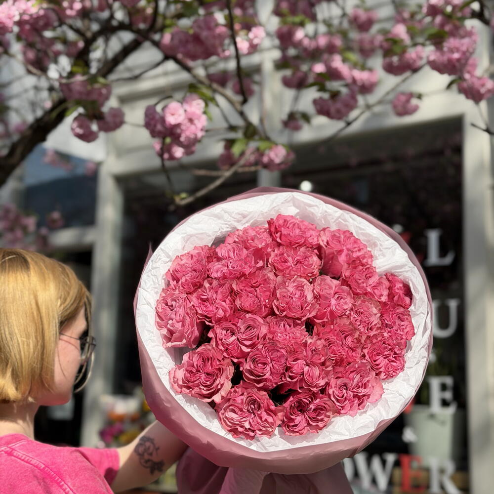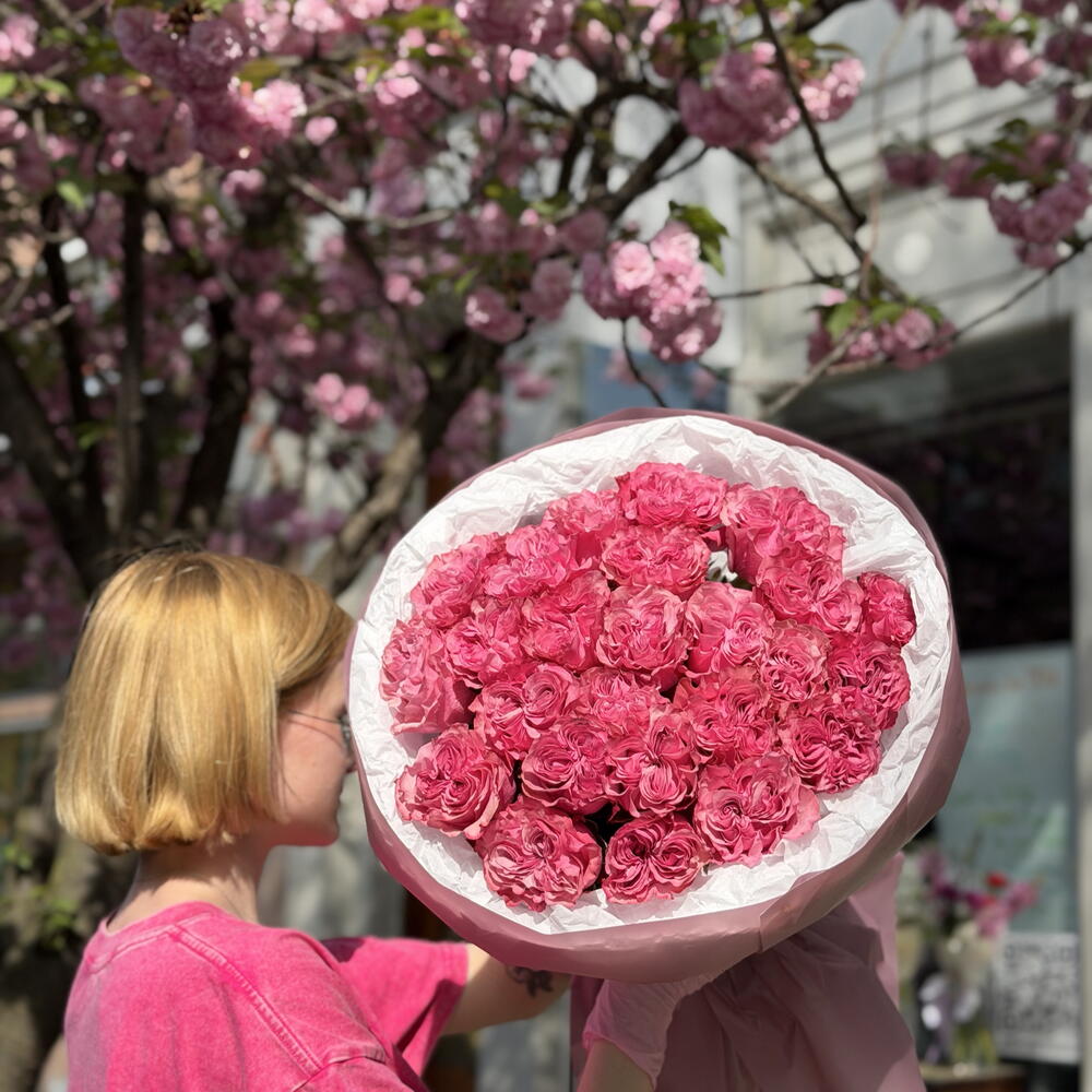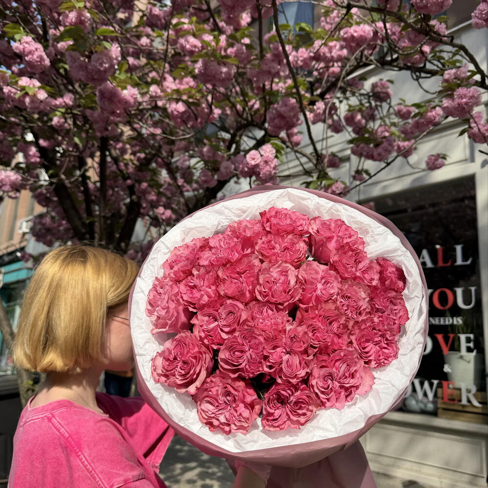 Букет красивый получился. Доставили немного позже назначенного времени, не критично для нас это было. Фото отчет сделали быстро. Доставка считаю дорогая, плюс большие розы не первой свежести были.
