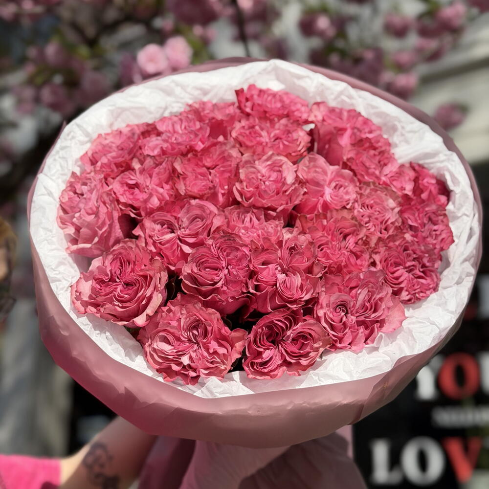 Уникальный и элегантный букет из роз нежно-розовых и лавандовых оттенков. Сочетание романтических румяных тонов с едва заметными фиолетовыми акцентами создает мечтательный, изысканный образ — идеально подходит для значимых подарков и особых случаев.