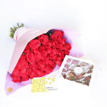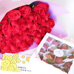 45 Roses Belgian Chocolate Strawberries Gift Set • Luxurious bouquet of 45 premium roses paired with chocolate-covered strawberries. • Fresh, juicy strawberries coated in rich Belgian chocolate. • Elegant combination of flowers and dessert in one premium gift set. • Stylish presentation, ready for gifting without additional packaging. • Perfect for birthdays, anniversaries, romantic surprises, thank-you gifts, and special occasions. • Designed as a deluxe gift for loved ones, friends, or meaningful celebrations. • Same-day delivery is available in New York. *Chocolate-covered strawberries are best enjoyed within 24 hours after delivery.