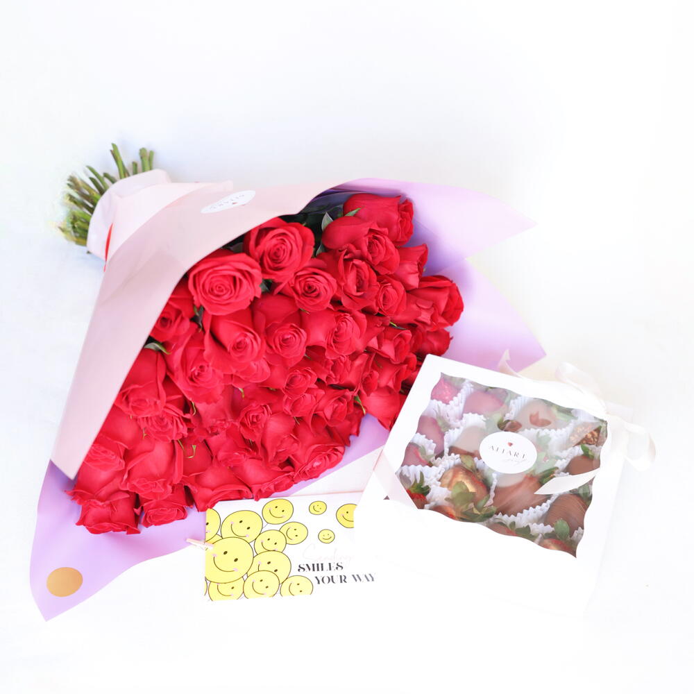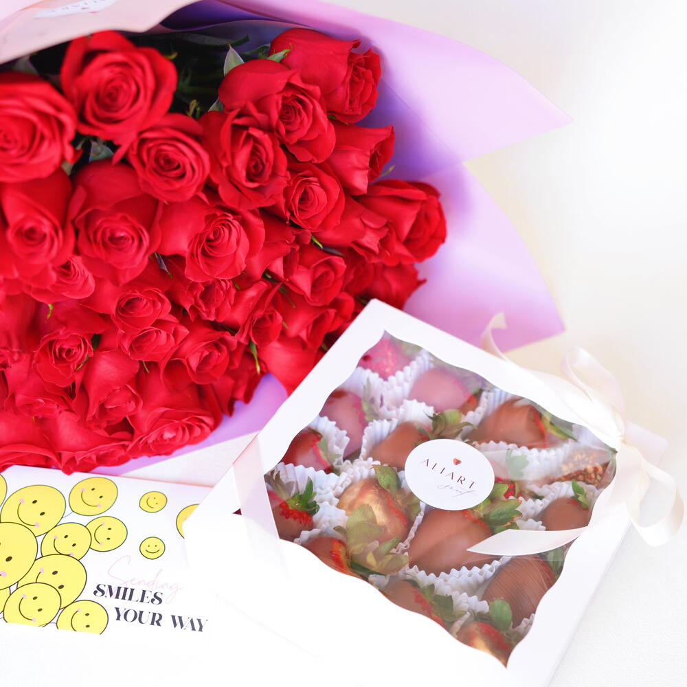 45 Roses Belgian Chocolate Strawberries Gift Set • Luxurious bouquet of 45 premium roses paired with chocolate-covered strawberries. • Fresh, juicy strawberries coated in rich Belgian chocolate. • Elegant combination of flowers and dessert in one premium gift set. • Stylish presentation, ready for gifting without additional packaging. • Perfect for birthdays, anniversaries, romantic surprises, thank-you gifts, and special occasions. • Designed as a deluxe gift for loved ones, friends, or meaningful celebrations. • Same-day delivery is available in New York. *Chocolate-covered strawberries are best enjoyed within 24 hours after delivery.