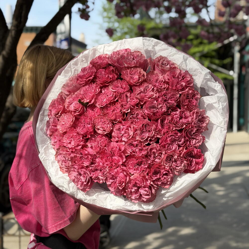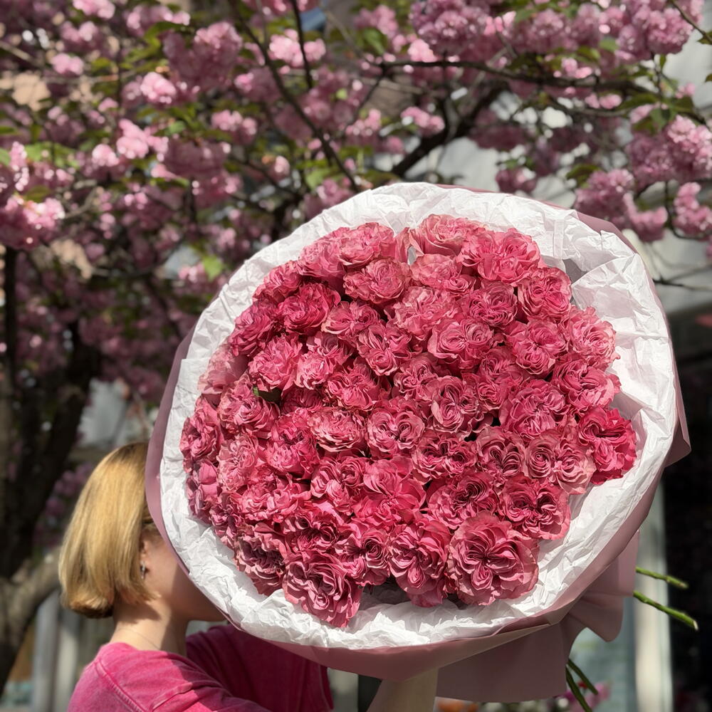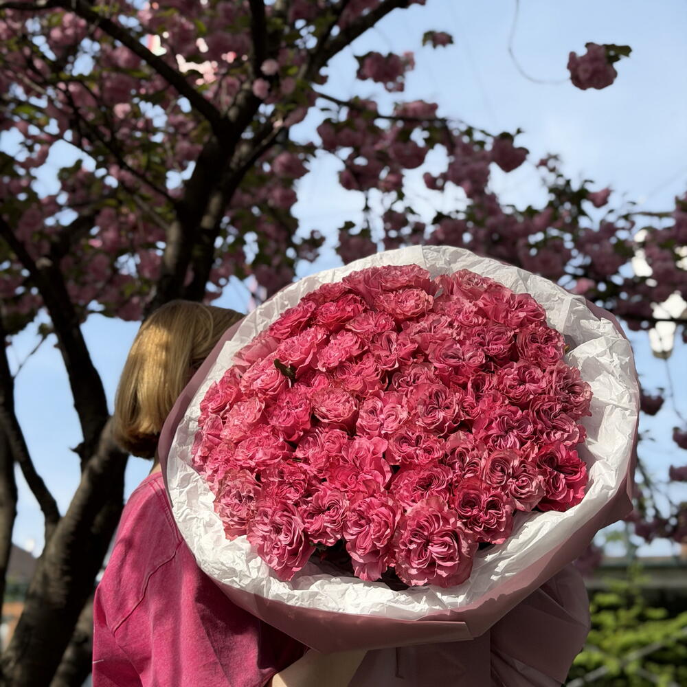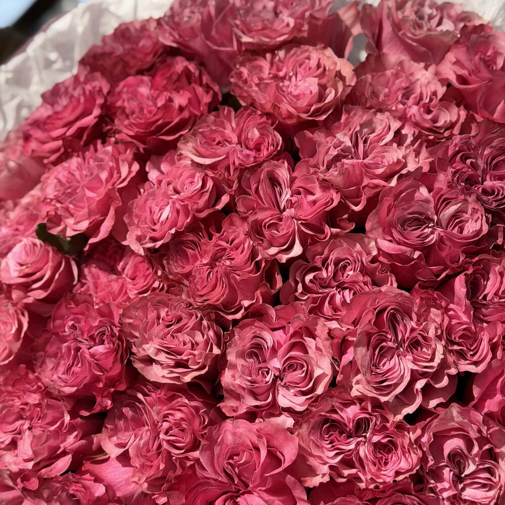 Уникальный и элегантный букет из роз нежно-розовых и лавандовых оттенков. Сочетание романтических румяных тонов с едва заметными фиолетовыми акцентами создает мечтательный, изысканный образ — идеально подходит для значимых подарков и особых случаев.