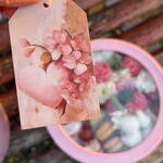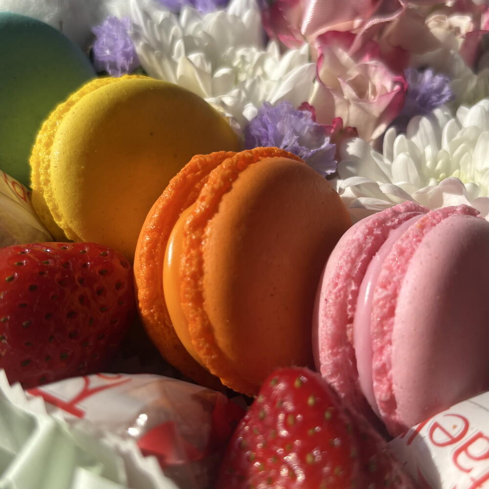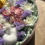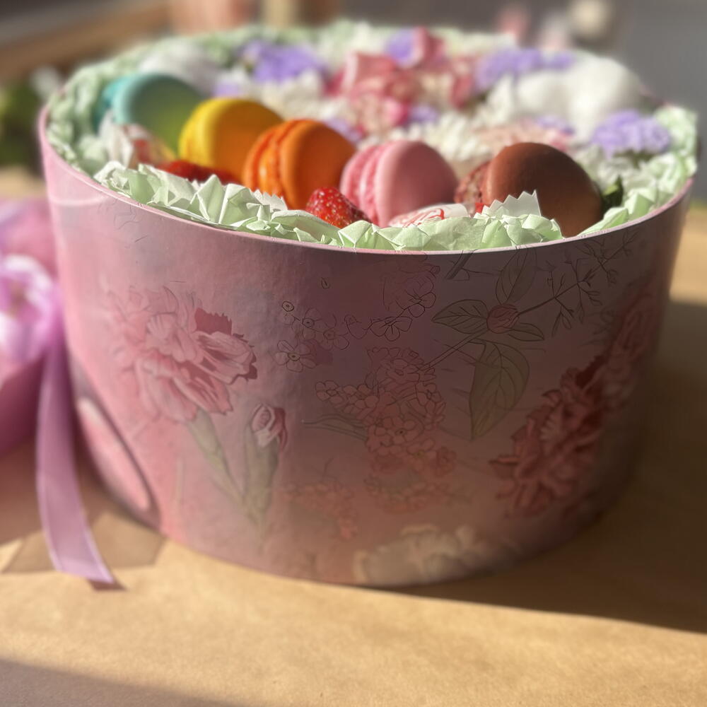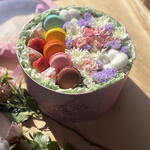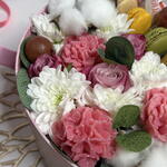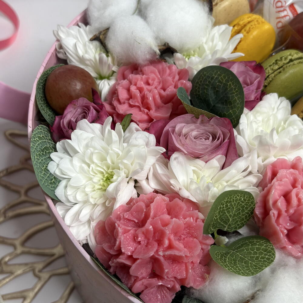 Хризантема - 1 шт. Raffaello - 3 шт. Cotton - 2 шт. box hat - 1 шт. card - 1 шт. macaroni - 6 шт. roses - 3 шт. chocolate flowers - 3 шт.