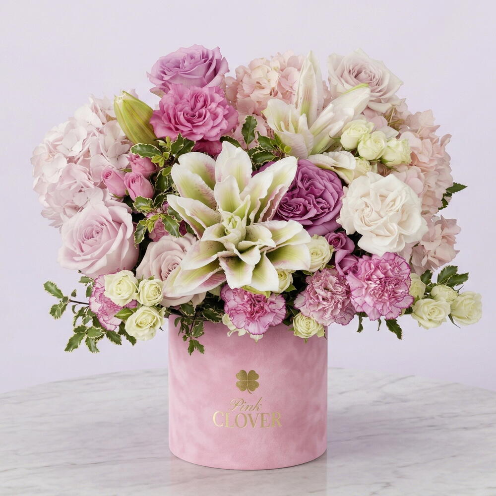 Эта потрясающая композиция из розовых цветов представляет собой прекрасное сочетание белых или розовых лилий, белых гортензий, розовых роз и свежей зелени, элегантно упакованных в роскошную бархатную коробку. Идеальный подарок на годовщину, вечеринку в честь рождения ребенка, день рождения или просто для того, чтобы удивить того, кто обожает лилии. Эта великолепная композиция сочетает розовые, фиолетовые и синие цветы в круглой коробке, привнося яркий и очаровательный штрих в любое пространство. Обратите внимание: цвет коробки может немного отличаться от фотографии.