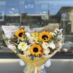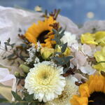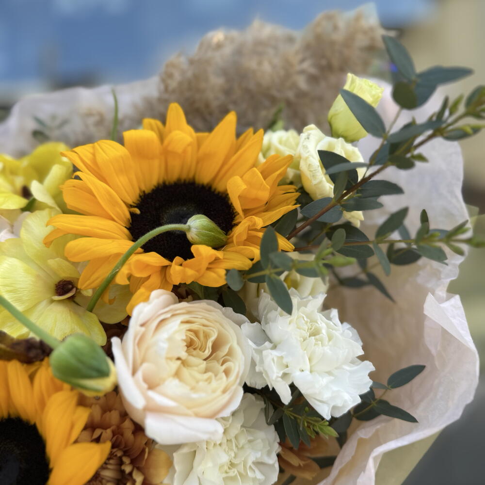 Гортензия - 1 шт. Эвкалипт - 3 шт. Эустома - 3 шт. Диантус - 3 шт. Гербера мини - 3 шт. Подсолнух - 3 шт. Упаковка дизайнерская - 4 шт. Ранункулюс баттерфляй - 2 шт.