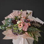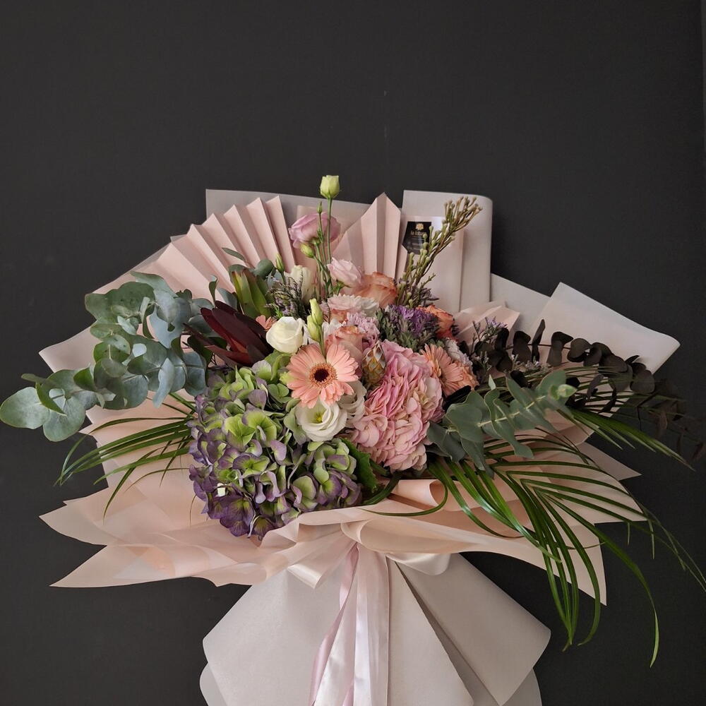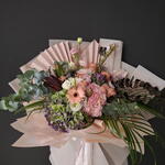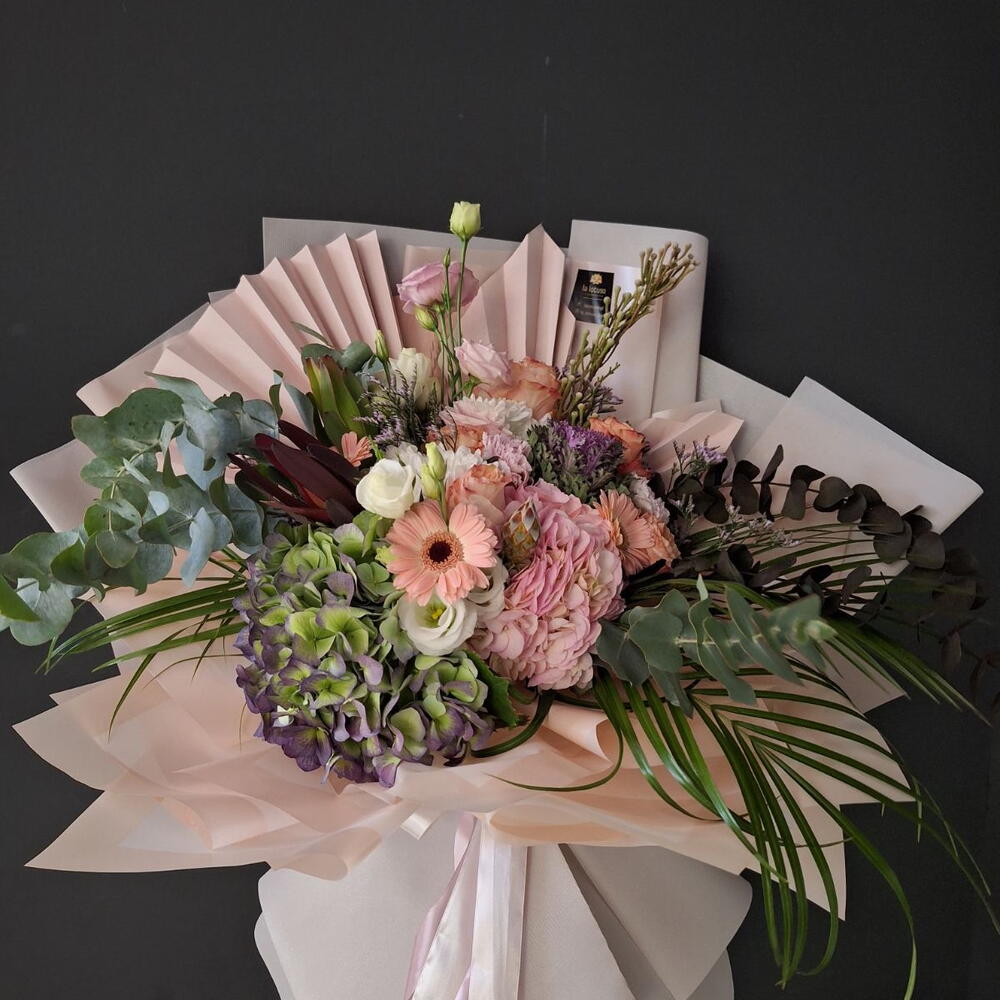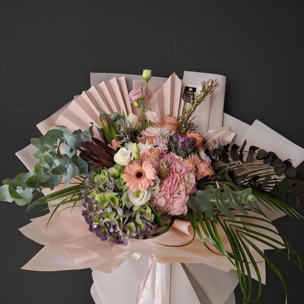 Leucadendron - 2 шт. Satin ribbon - 2 шт. Eucalyptus - 5 шт. Gerbera - 3 шт. Lisianthus - 4 шт. wrapping paper - 8 шт. palm leaf - 3 шт. смесь зелени - 4 шт. roses - 3 шт. особенный цветок - 3 шт.