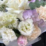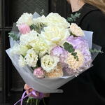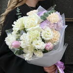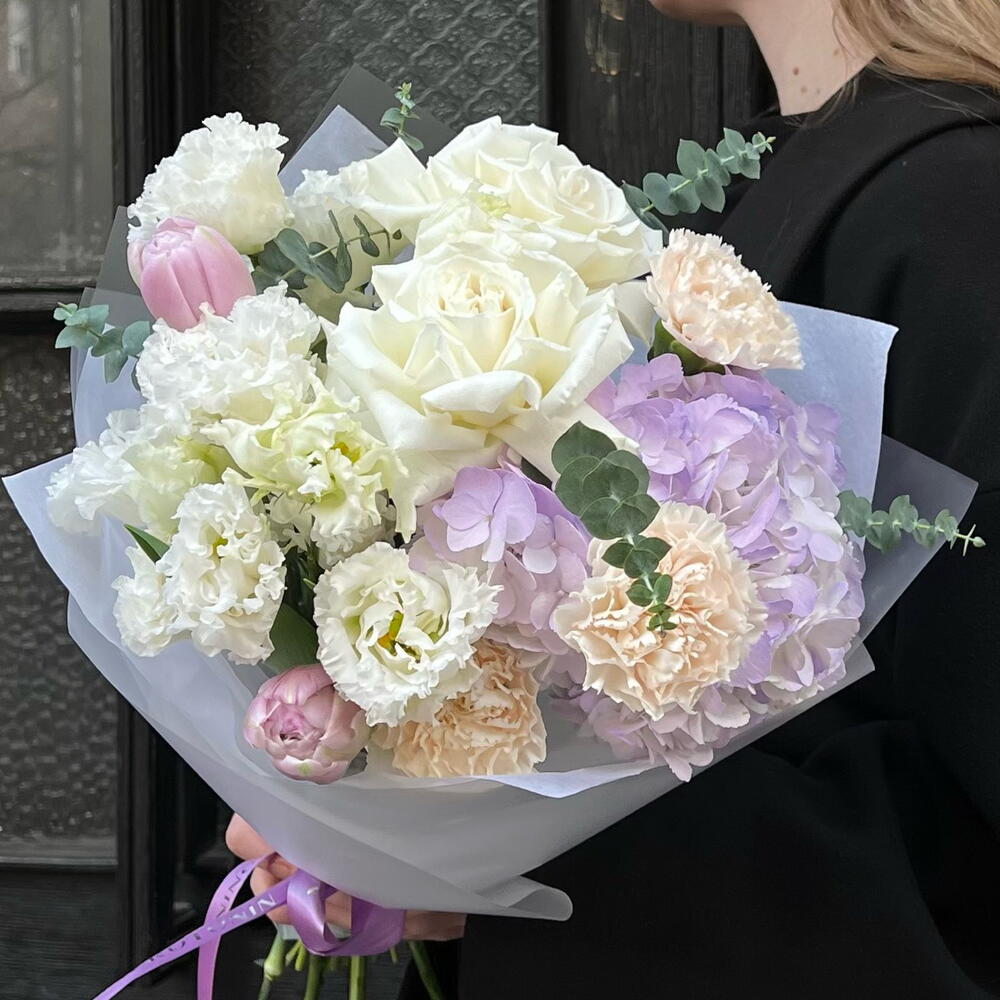 Эустома - 2 шт. Tulips - 2 шт. hortensia - 1 шт. rose - 2 шт. dianthus - 3 шт.