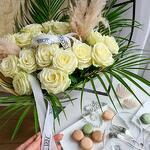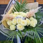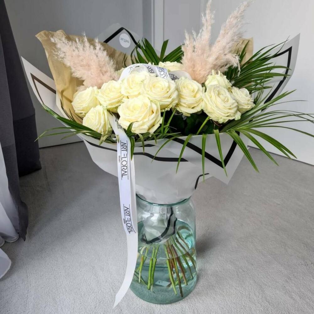 Blumenstrauß Oase Die weißen Rosen sind ein Symbol für Reinheit und Unschuld. Mit ihren zarten, cremeweißen Blütenblättern strahlen sie eine zeitlose Eleganz und Anmut aus. Die Palmblätter, mit ihrer exotischen Ausstrahlung, fügen dem Bouquet eine Hauch von Tropen hinzu. Das Pampasgras verleiht diesem Bouquet eine zeitgemäße und moderne Note. Seine flauschigen Wedel fügen eine besondere Textur und Leichtigkeit hinzu, die dem Strauß eine unvergleichliche Präsenz verleihen. Ein Bouquet aus weißen Rosen, Palmblättern und Pampasgras ist perfekt, um Ihre Wertschätzung und Bewunderung auszudrücken, sei es zu einem besonderen Anlass oder einfach, um jemandem zu zeigen, wie sehr Sie seine Einzigartigkeit schätzen. Dieser Strauß ist ein Symbol für die Schönheit der Einfachheit und die Pracht der Natur, die die Herzen im Sturm erobert und die Seele berührt. Wir achten ständig auf die letzten Trends im Bereich des Floristikdesigns und unsere Bouquets sind die Reflexion davon. Bei der Zusammenstellung verwenden wir nur ganz frische Blumen und die modernsten Materialien. Unser Team steckt besondere Liebe zum Detail in jedes Arrangement, deshalb finden Sie immer einen Sticker mit unserem Logo und ein Firmen Bändchen als Qualitätssiegel an jedem Strauß. Dem Blumenstrauß legen wir eine Anleitung zur Pflege und ein Mittel zur Verlängerung der Lebensdauer der Blumen bei. Jetzt ganz bequem bestellen und Ihre Blumen an Ihre Wunschadresse liefern lassen. ширина, см: 45 высота, см: 67 длина, см: 43