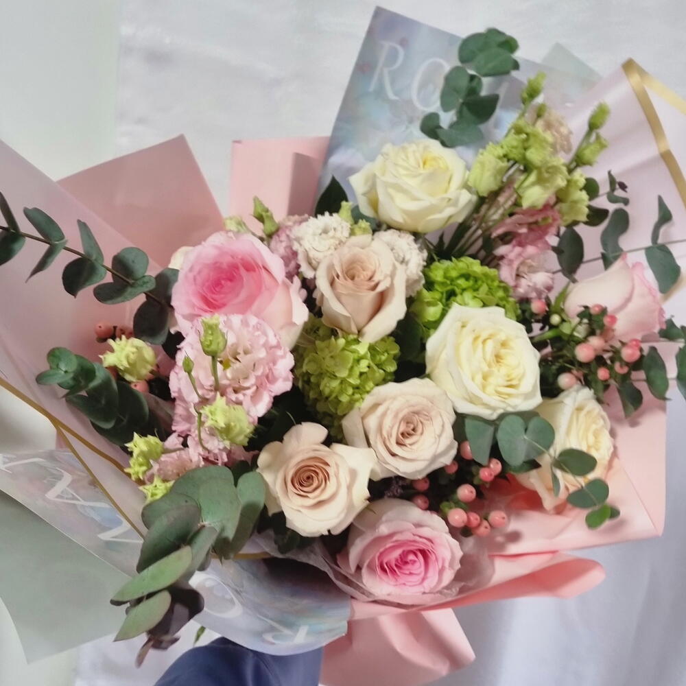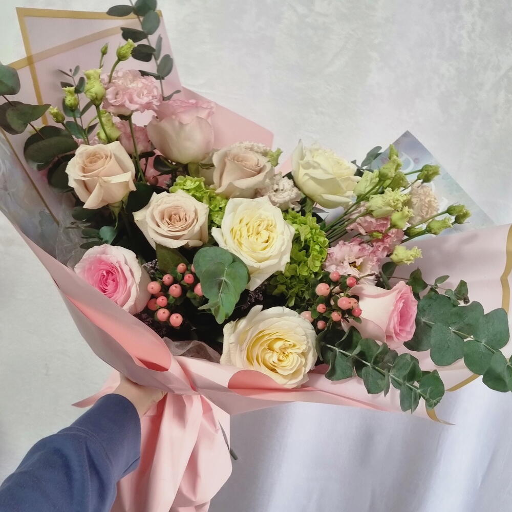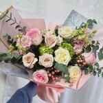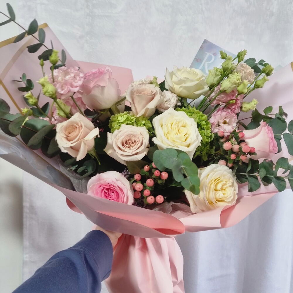 Нежный букет, оформленный в мягкой пастельной цветовой гамме, с розами в сочетании с сезонными цветами и декоративной зеленью. Композиция выполнена в нежных кремовых и нежно-розовых тонах и завершена элегантной упаковкой. Этот букет подходит в качестве продуманного подарка без привязки к конкретному поводу.