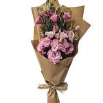 Eustoma bouquet wrapped in natural colored paper with decorative rope ribbon.