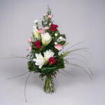 Ruscus - 1 шт. Pistacia - 1 шт. Beargrass - 1 шт. rose red - 3 шт. thlaspi green bell - 1 шт. carnations spray - 3 шт. liilia - 1 шт. листья аспедистры - 3 шт.