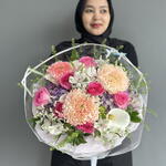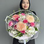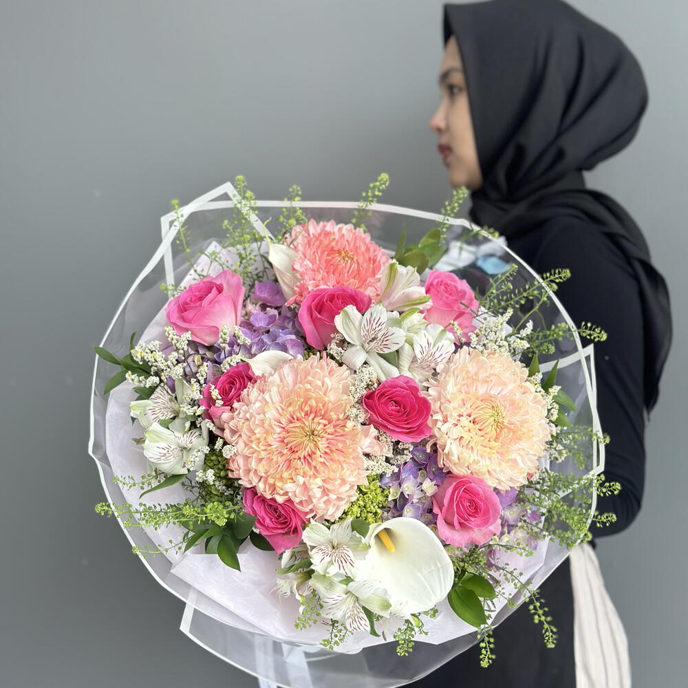 hydrangea purple - 3 шт. limonium white - 2 шт. rose pink candy - 7 шт. thilapsi - 2 шт. calaleli - 3 шт. rx pink - 3 шт. alstromeria white import - 3 шт.