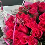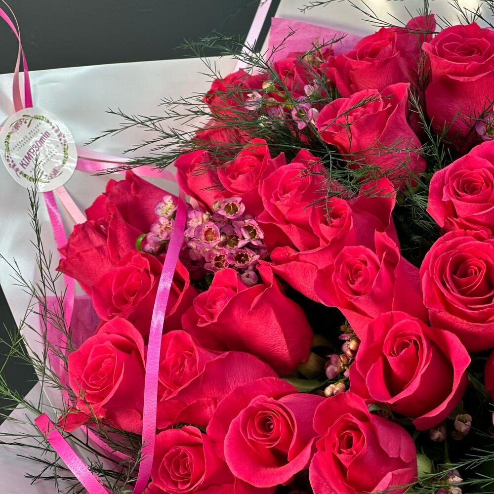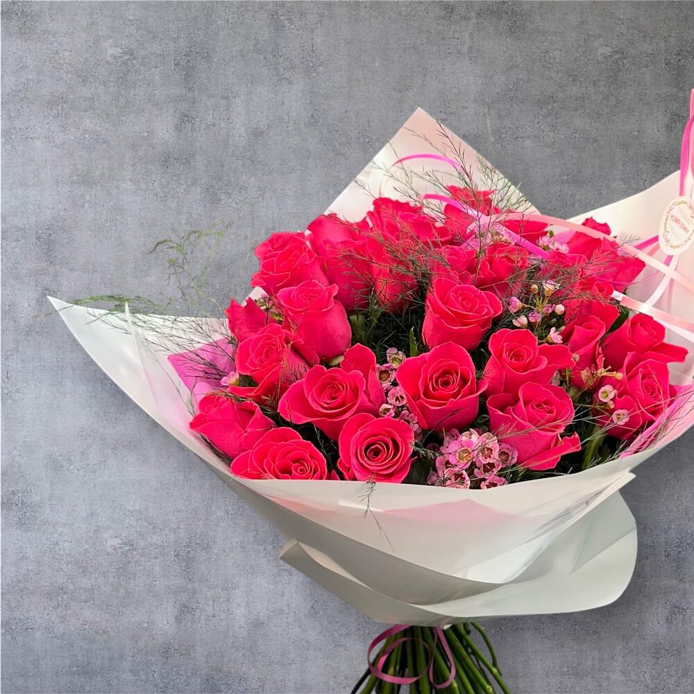 Bouquet of 25 hot pink roses (large bud) 40cm with additions