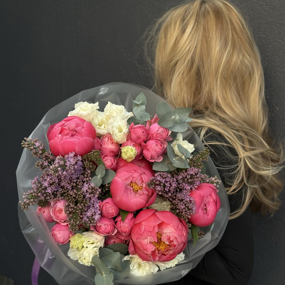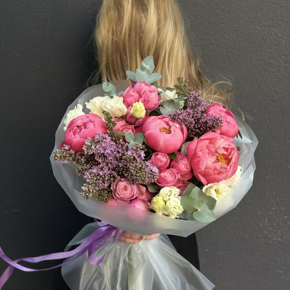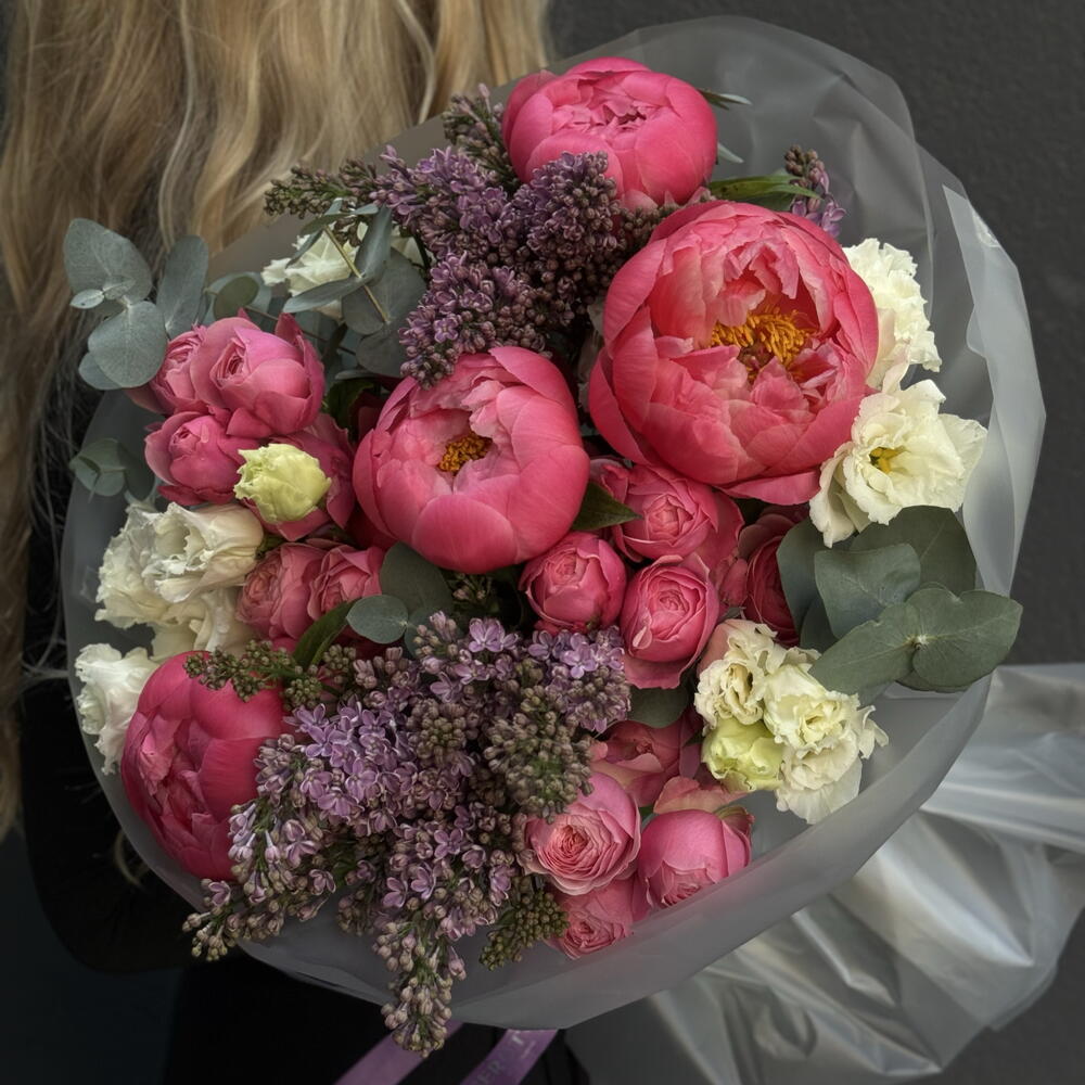 Eucalyptus - 4 шт. Spray rose - 4 шт. Lilac - 4 шт. eystoma - 4 шт. peonia - 5 шт.