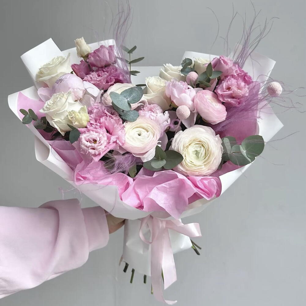 Lisianthus - 5 шт. ranunculus - 7 шт. euqualiptus - 7 шт. roses - 7 шт. розы для любимой - 3 шт.
