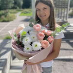 Ribbon - 2 шт. Eucalyptus - 1 шт. Spray rose - 3 шт. Chrysanthemum - 3 шт. paper - 6 шт.