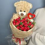 Tulips - 21 шт. Bear - 1 шт. paper - 2 шт. heart on a stick - 1 шт.