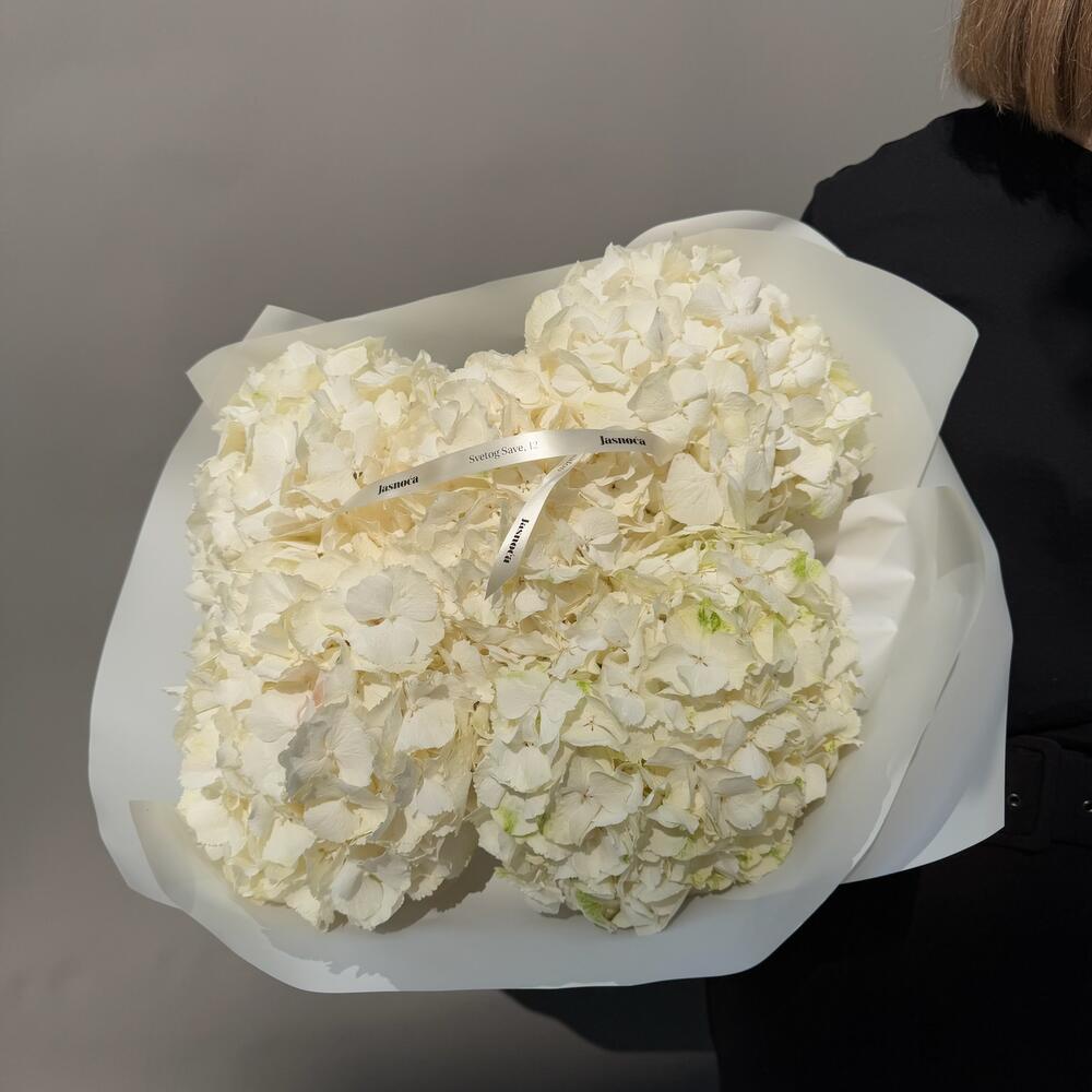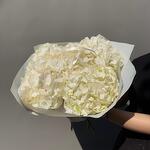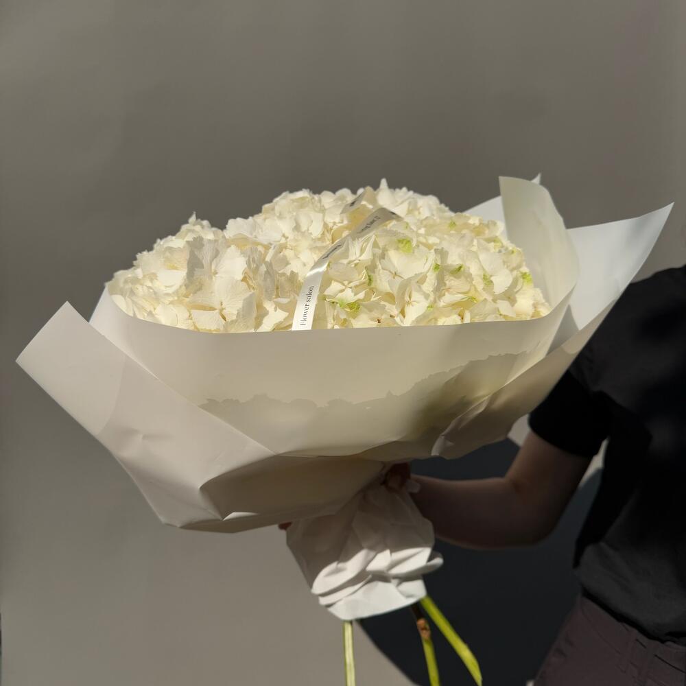 Lush bouquet with white hydrangeas. It looks incredibly striking and is perfect for any occasion! Bouquet sizes are approximate. What you get: • A detailed care guide to help your flowers last longer • Flower food to preserve freshness up to 5-7 days • A gift bag for safe delivery